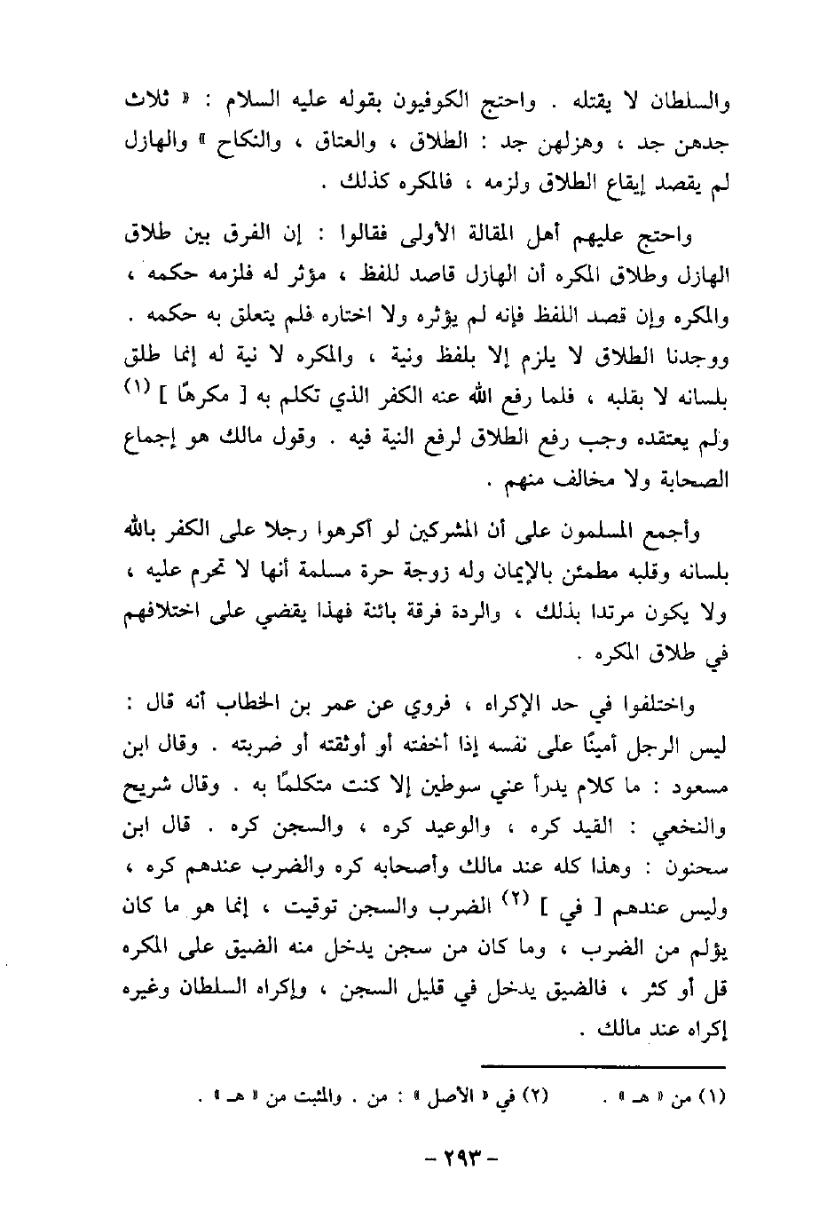 والسلطان لا يقتله. واحتج الكوفيون بقوله (صلى الله عليه وسلم) : (ثلاث جدهن جد، وهزلهن جد: الطلاق، والعتاق، والنكاح) والهازل لم يقصد إيقاع الطلاق ولزمه، فالمكره كذلك. واحتج عليهم أهل المقالة الأولى فقالوا: إن الفرق بين طلاق الهازل وطلاق المكره أن الهازل قاصد للفظ، مؤثر له فلزمه حكمه، والمكره وإن قصد اللفظ فإنه لم يؤثره ولا اختاره فلم يتعلق به حكمه. ووجدنا الطلاق لا يلزم إلا بلفظ ونية، والمكره لا نية له إنما طلق بلسانه لا بقلبه، فلما رفع الله عنه الكفر الذى تكلم به مكرهًا ولم يعتقده وجب رفع الطلاق لرفع النية فيه. وقول مالك هو إجماع الصحابة ولا مخالف منهم. وأجمع المسلمون على أن المشركين لو أكرهوا رجلا على الكفر بالله بلسانه وقلبه مطمئن بالإيمان وله زوجة حرة مسلمة أنها لا تحرم عليه، ولا يكون مرتدا بذلك، والردة فرقة بائنة فهذا يقضى على اختلافهم فى طلاق المكره. واختلفوا فى حد الإكراه، فروى عن عمر بن الخطاب أنه قال: ليس الرجل أمينًا على نفسه إذا أخفته أو أوثقته أو ضربته. وقال ابن مسعود: ما كلام يدرأ عنى سوطين إلا كنت متكلمًا به. وقال شريح والنخعى: القيد كره، والوعيد كره، والسجن كره. قال ابن سحنون: وهذا كله عند مالك وأصحابه كره والضرب عندهم كره، وليس عندهم فى الضرب والسجن توقيت، إنما هو ما كان يؤلم من الضرب، وما كان من سجن يدخل منه الضيق على المكره قل أو كثر، فالضيق يدخل فى قليل السجن، وإكراه السلطان وغيره إكراه عند مالك.