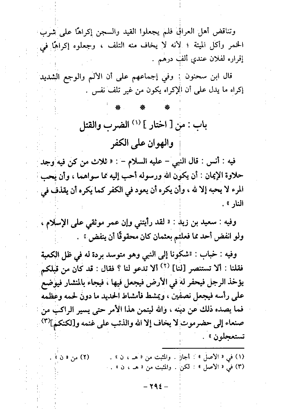 / 2 - فيه: أَنَسٍ: قَالَ النبى (صلى الله عليه وسلم) : (ثَلاثٌ مَنْ كُنَّ فِيهِ وَجَدَ حَلاوَةَ الإيمَانِ: أَنْ يَكُونَ اللَّهُ وَرَسُولُهُ أَحَبَّ إِلَيْهِ مِمَّا سِوَاهُمَا، وَأَنْ يُحِبَّ الْمَرْءَ لا يُحِبُّهُ إِلا لِلَّهِ، وَأَنْ يَكْرَهَ أَنْ يَعُودَ فِى الْكُفْرِ كَمَا يَكْرَهُ أَنْ يُقْذَفَ فِى النَّارِ) . / 3 - وفيه: سَعِيدَ بْنَ زَيْدٍ، لَقَدْ رَأَيْتُنِى، وَإِنَّ عُمَرَ مُوثِقِى عَلَى الإسْلامِ، وَلَوِ انْقَضَّ أُحُدٌ مِمَّا فَعَلْتُمْ بِعُثْمَانَ كَانَ مَحْقُوقًا أَنْ يَنْقَضَّ. / 4 - وفيه: خَبَّابِ شَكَوْنَا إِلَى النبى (صلى الله عليه وسلم) وَهُوَ مُتَوَسِّدٌ بُرْدَةً لَهُ فِى ظِلِّ الْكَعْبَةِ، فَقُلْنَا: أَلا تَسْتَنْصِرُ لَنَا؟ أَلا تَدْعُو لَنَا؟ فَقَالَ: قَدْ كَانَ مَنْ قَبْلَكُمْ يُؤْخَذُ الرَّجُلُ، فَيُحْفَرُ لَهُ فِى الأرْضِ، فَيُجْعَلُ فِيهَا فَيُجَاءُ بِالْمِنْشَارِ، فَيُوضَعُ عَلَى رَأْسِهِ، فَيُجْعَلُ نِصْفَيْنِ، وَيُمْشَطُ بِأَمْشَاطِ الْحَدِيدِ مَا دُونَ لَحْمِهِ وَعَظْمِهِ، فَمَا يَصُدُّهُ ذَلِكَ عَنْ دِينِهِ، وَاللَّهِ لَيَتِمَّنَّ هَذَا الأمْرُ حَتَّى يَسِيرَ الرَّاكِبُ مِنْ صَنْعَاءَ إِلَى حَضْرَمَوْتَ لا يَخَافُ إِلا اللَّهَ وَالذِّئْبَ عَلَى غَنَمِهِ، وَلَكِنَّكُمْ تَسْتَعْجِلُونَ) .
