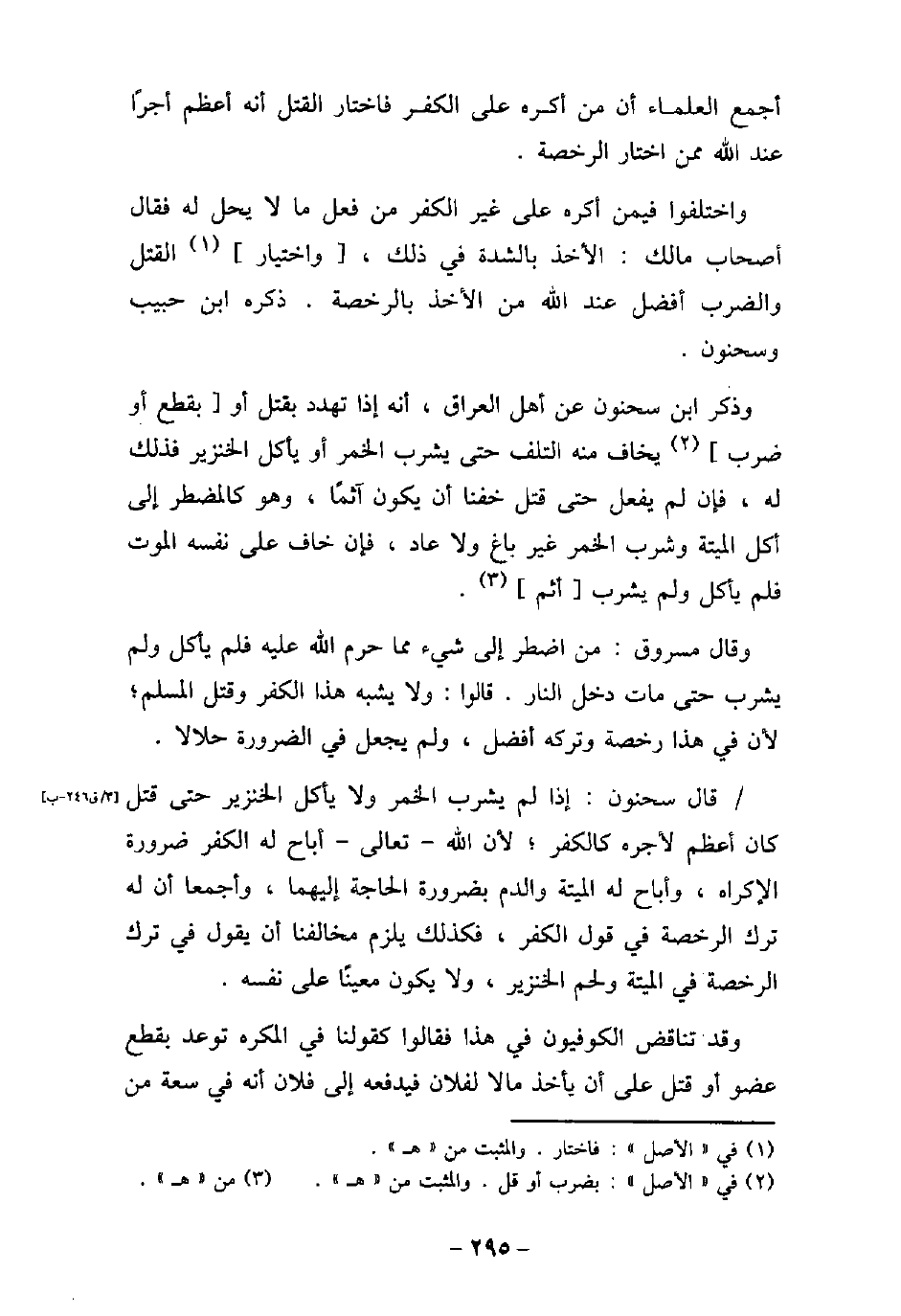 أجمع العلماء أن من أكره على الكفر فاختار القتل أنه أعظم أجرًا عند الله ممن اختار الرخصة. واختلفوا فيمن أكره على غير الكفر من فعل ما لا يحل له فقال أصحاب مالك: الأخذ بالشدة فى ذلك، واختيار القتل والضرب أفضل عند الله من الأخذ بالرخصة. ذكره ابن حبيب وسحنون. وذكر ابن سحنون عن أهل العراق، أنه إذا تهدد بقتل أو بقطع أو ضرب يخاف منه التلف حتى يشرب الخمر أو يأكل الخنزير فذلك له، فإن لم يفعل حتى قتل أن يكون آثمًا، وهو كالمضطر إلى أكل الميتة وشرب الخمر غير باغ ولا عاد، فإن خاف على نفسه الموت فلم يأكل ولم يشرب أثم. وقال مسروق: من اضطر إلى شىء مما حرم الله عليه فلم يأكل ولم يشرب حتى مات دخل النار. قالوا: ولا يشبه هذا الكفر وقتل المسلم؛ لأن فى هذا رخصة وتركه أفضل، ولم يجعل فى الضرورة حلالا. قال سحنون: إذا لم يشرب الخمر ولا يأكل الخنزير حتى قتل كان أعظم لأجره كالكفر؛ لأن الله تعالى أباح له الكفر ضرورة الإكراه، وأباح له الميتة والدم بضرورة الحاجة إليهما، وأجمعا أن له ترك الرخصة فى قول الكفر، فكذلك يلزم مخالفنا أن يقول فى ترك الرخصة فى الميتة ولحم الخنزير، ولا يكون معينًا على نفسه. وقد تناقض الكوفيون فى هذا فقالوا كقولنا فى المكره توعد بقطع عضو أو قتل على أن يأخذ مالا لفلان فيدفعه إلى فلان أنه فى سعة من