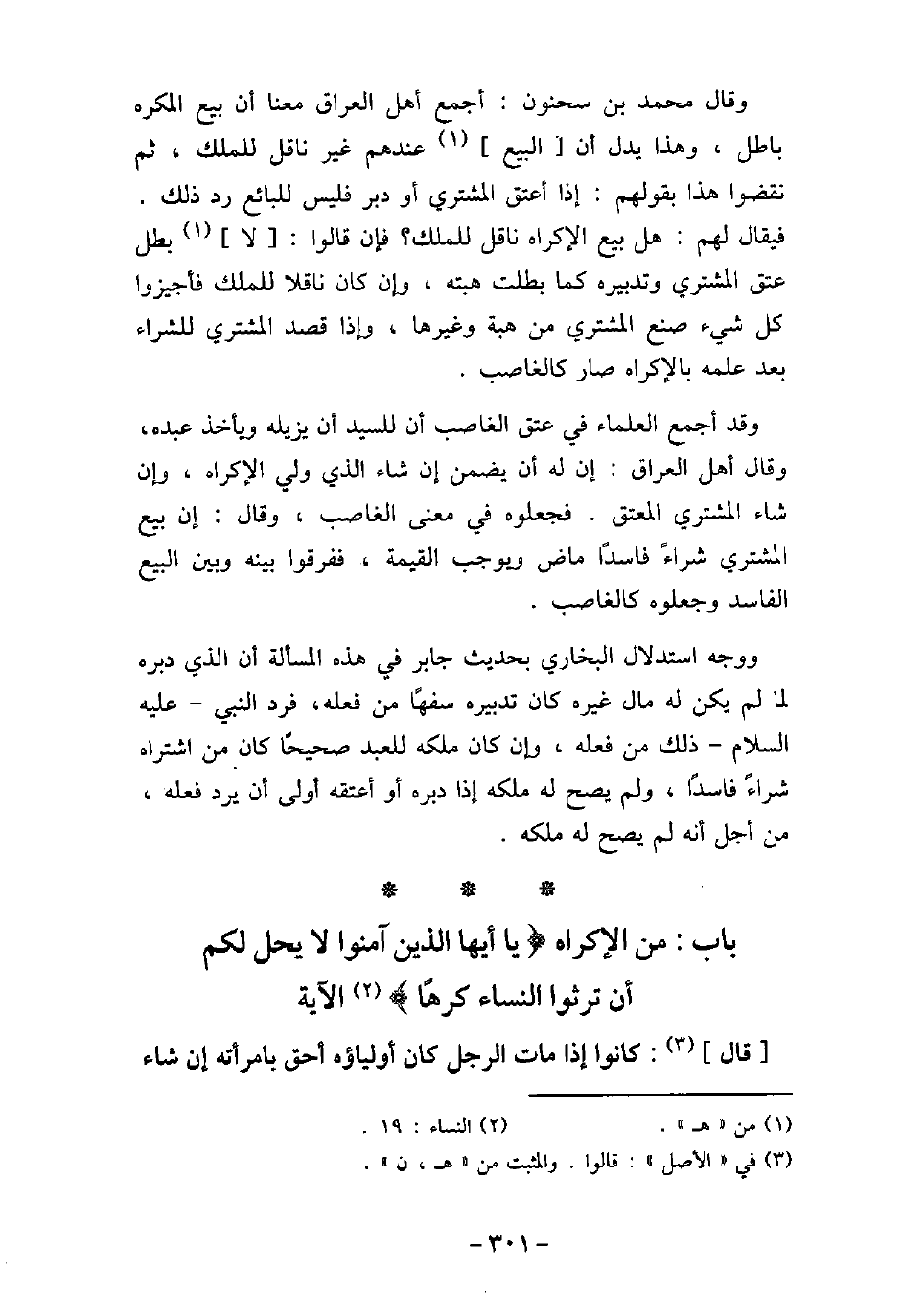 وقال محمد بن سحنون: أجمع أهل العراق معنا أن بيع المكره باطل، وهذا يدل أن البيع عندهم غير ناقل للملك، ثم نقضوا هذا بقولهم: إذا أعتق المشترى أو دبر فليس للبائع رد ذلك. فيقال لهم: هل بيع الإكراه ناقل للملك؟ فإن قالوا: لا بطل عتق المشترى وتدبيره كما بطلت هبته، وإن كان ناقلا للملك فأجيزوا كل شىء صنع المشترى من هبة وغيرها، وإذا قصد المشترى للشراء بعد علمه بالإكراه صار كالغاصب. وقد أجمع العلماء فى عتق الغاصب أن للسيد أن يزيله ويأخذ عبده، وقال أهل العراق: إن له أن يضمن إن شاء الذى ولى الإكراه، وإن شاء المشترى المعتق. فجعلوه فى معنى الغاصب، وقال: إن بيع المشترى شراءً فاسدًا ماض ويوجب القيمة، ففرقوا بينه وبين البيع الفاسد وجعلوه كالغاصب. ووجه استدلال البخارى بحديث جابر فى هذه المسألة أن الذى دبره لما لم يكن له مال غيره كان تدبيره سفهًا من فعله، فرد النبى (صلى الله عليه وسلم) ذلك من فعله، وإن كان ملكه للعبد صحيحًا كان من اشتراه شراءً فاسدًا، ولم يصح له ملكه إذا دبره أو أعتقه أولى أن يرد فعله، من أجل أنه لم يصح له ملكه.