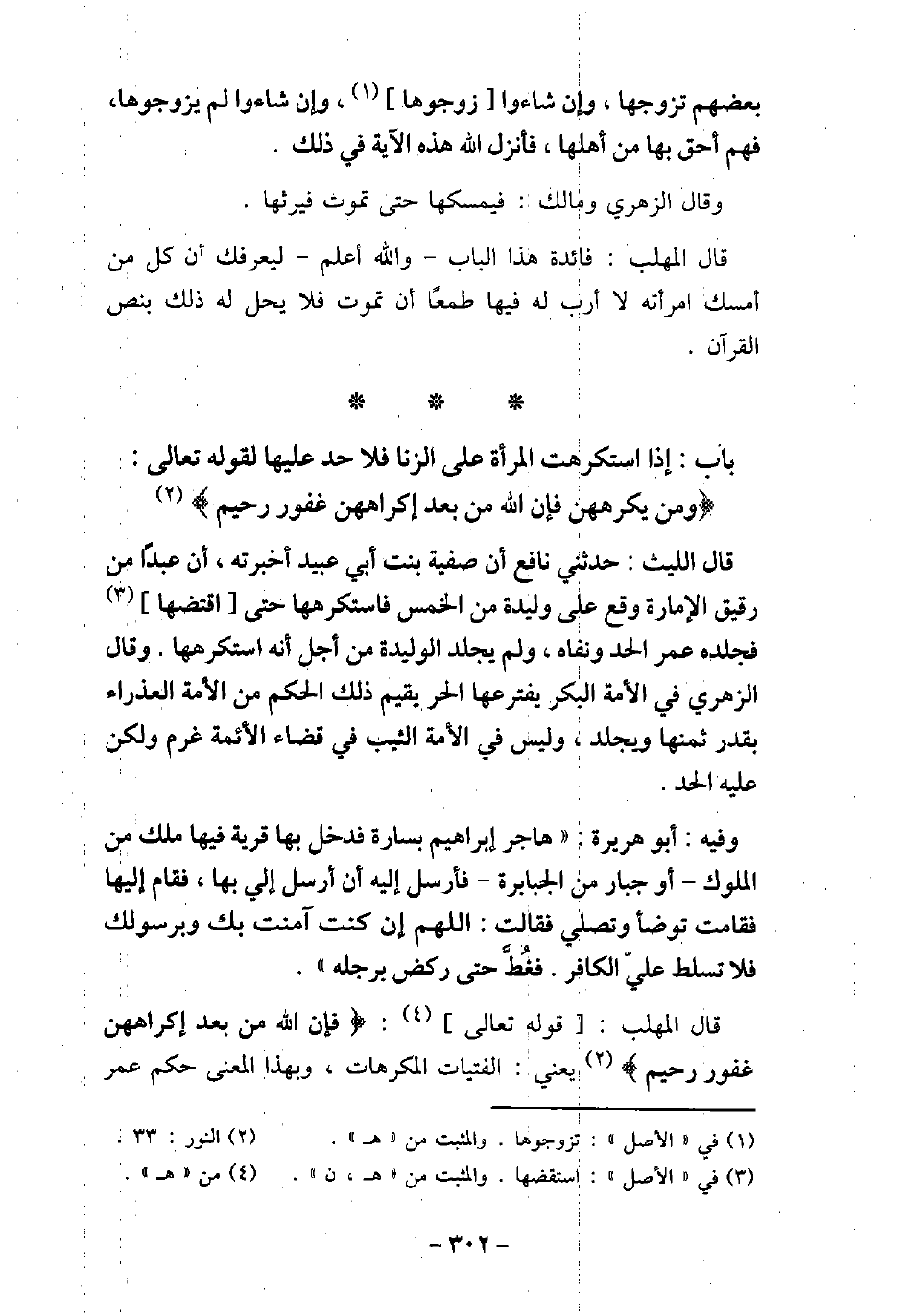 قَالَ اللَّيْثُ: حَدَّثَنِى نَافِعٌ أَنَّ صَفِيَّةَ بِنْتَ أَبِى عُبَيْدٍ أَخْبَرَتْهُ أَنَّ عَبْدًا مِنْ رَقِيقِ الإمَارَةِ وَقَعَ عَلَى وَلِيدَةٍ مِنَ الْخُمُسِ، فَاسْتَكْرَهَهَا حَتَّى اقْتَضَّهَا، فَجَلَدَهُ عُمَرُ الْحَدَّ، وَنَفَاهُ وَلَمْ يَجْلِدِ الْوَلِيدَةَ مِنْ أَجْلِ أَنَّهُ اسْتَكْرَهَهَا. وَقَالَ الزُّهْرِىُّ فِى الأمَةِ الْبِكْرِ يَفْتَرِعُهَا الْحُرُّ: يُقِيمُ ذَلِكَ الْحَكَمُ مِنَ الأمَةِ الْعَذْرَاءِ بِقَدْرِ ثَمَنَها وَقِيمَتِهَا، وَيُجْلَدُ وَلَيْسَ فِى الأمَةِ الثَّيِّبِ فِى قَضَاءِ الأئِمَّةِ غُرْمٌ، وَلَكِنْ عَلَيْهِ الْحَدُّ. / 9 - وفيه: أَبُو هُرَيْرَةَ، هَاجَرَ إِبْرَاهِيمُ بِسَارَةَ، فَدَخَلَ بِهَا قَرْيَةً فِيهَا مَلِكٌ مِنَ الْمُلُوكِ، أَوْ جَبَّارٌ مِنَ الْجَبَابِرَةِ، فَأَرْسَلَ إِلَيْهِ أَنْ أَرْسِلْ إِلَىَّ بِهَا، فَقَامَ إِلَيْهَا، فَقَامَتْ تَوَضَّأُ وَتُصَلِّى، فَقَالَتِ: اللَّهُمَّ إِنْ كُنْتُ آمَنْتُ بِكَ وَبِرَسُولِكَ، فَلا تُسَلِّطْ عَلَىَّ الْكَافِرَ، فَغُطَّ حَتَّى رَكَضَ بِرِجْلِهِ) . قال المهلب: قوله تعالى: (فإن الله من بعد إكراههن غفور رحيم) [النور: 33] يعنى الفتيات المكرهات، بهذا المعنى حكم عمر