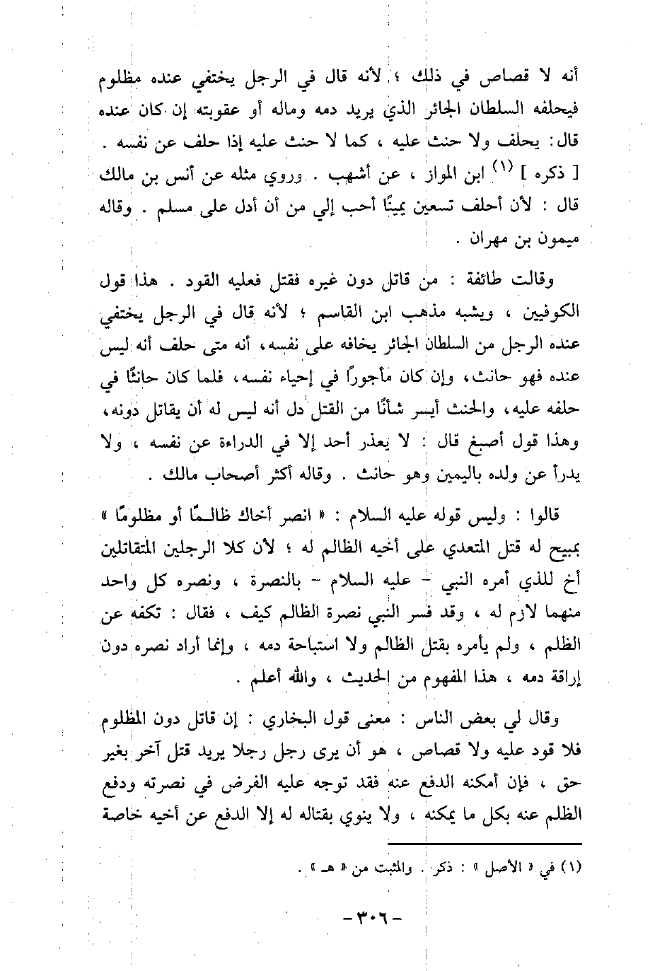أنه لا قصاص فى ذلك؛ لأنه قال فى الرجل يختفى عنده مظلوم فيحلفه السلطان الجائر الذى يريد دمه وماله أو عقوبته إن كان عنده قال: يحلف ولا حنث عليه، كما لا حنث عليه إذا حلف عن نفسه. ذكره ابن المواز، عن أشهب. وروى مثله عن أنس بن مالك قال: لأن أحلف تسعين يمينًا أحب إلى من أن أدل على مسلم. قاله ميمون بن مهران. وقالت طائفة: من قاتل دون غيره فقتل فعليه القود. هذا قول الكوفيين، ويشبه مذهب ابن القاسم؛ لأنه قال فى الرجل يختفى عنده الرجل من السلطان الجائر يخافه على نفسه، أنه متى حلف أنه ليس عنده فهو حانث، وإن كان مأجورًا فى إحياء نفسه، فلما كان حانثًا فى حلفه عليه، والحنث أيسر شأنًا من القتل دل أنه ليس له أن يقاتل دونه، وهذا قول أصبغ قال: لا يعذر أحد إلا فى الدراءة عن نفسه، ولا يدرأ عن ولده باليمين وهو حانث. وقاله أكثر أصحاب مالك. قالوا: وليس قوله (صلى الله عليه وسلم) : (انصر أخاك ظالمًا أو مظلومًا) بمبيح له قتل المتعدى على أخيه الظالم له؛ لأن كلا الرجلين المتقاتلين أخ للذى أمره النبى (صلى الله عليه وسلم) بالنصرة، ونصره كل واحد منهما لازم له، وقد فسر النبى (صلى الله عليه وسلم) نصرة الظالم كيف، فقال: تكفه عن الظلم، ولم يأمره بقتل الظالم ولا استباحة دمه، وإنما أراد نصره دون إراقة دمه، هذا المفهوم من الحديث، والله أعلم. وقال لى بعض الناس: معنى قول البخارى: إن قاتل دون المظلوم فلا قود عليه ولا قصاص، هو أن يرى رجل رجلا يريد قتل آخر بغير حق، فإن أمكنه الدفع عنه فقد توجه عليه الفرض فى نصرته ودفع الظلم عنه بكل ما يمكنه، ولا ينوى بقتاله له إلا الدفع عن أخيه خاصة