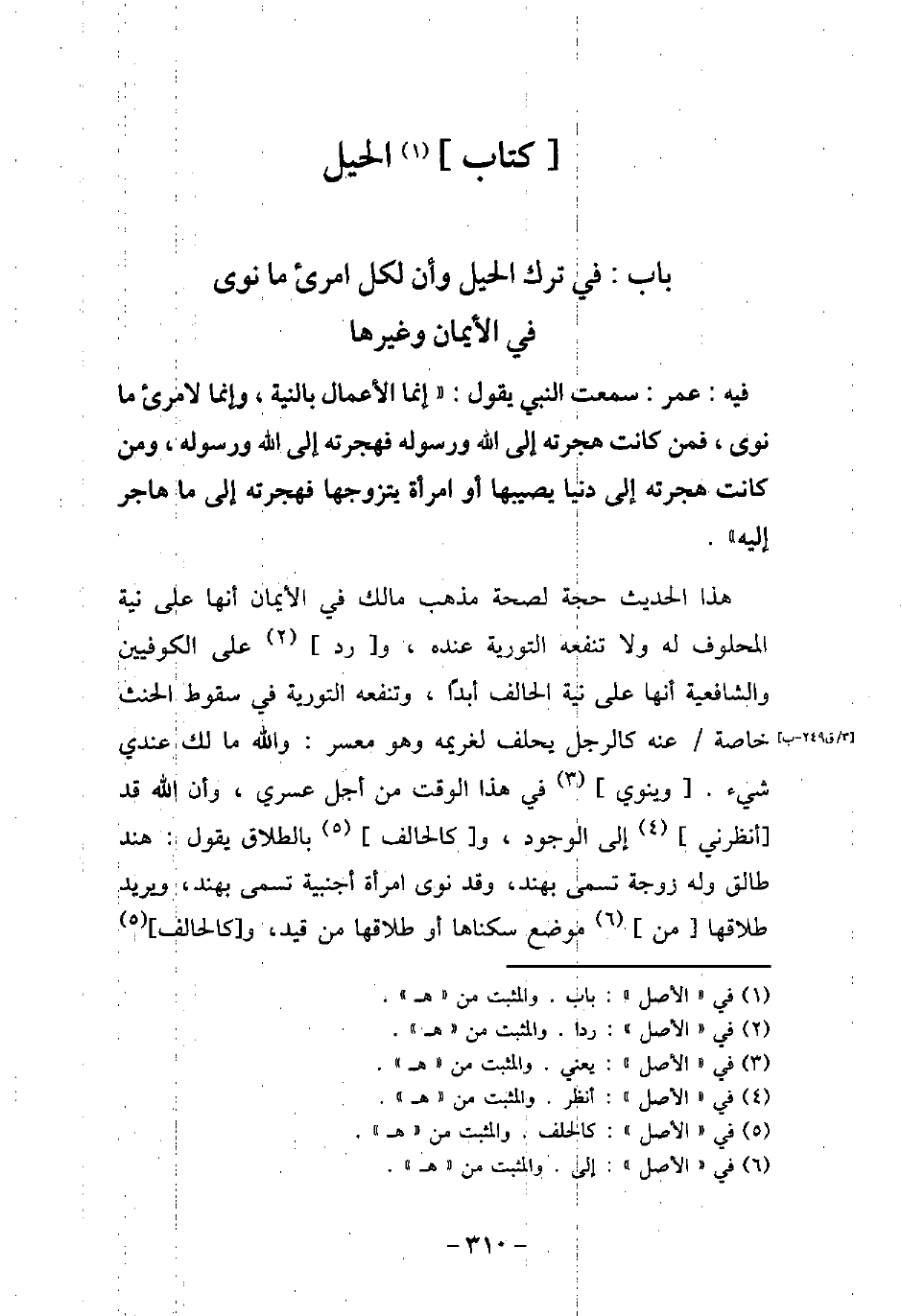- باب فِى تَرْكِ الْحِيَلِ وَأَنَّ لِكُلِّ امْرِئٍ مَا نَوَى فِى الأيْمَانِ وَغَيْرِهَا
