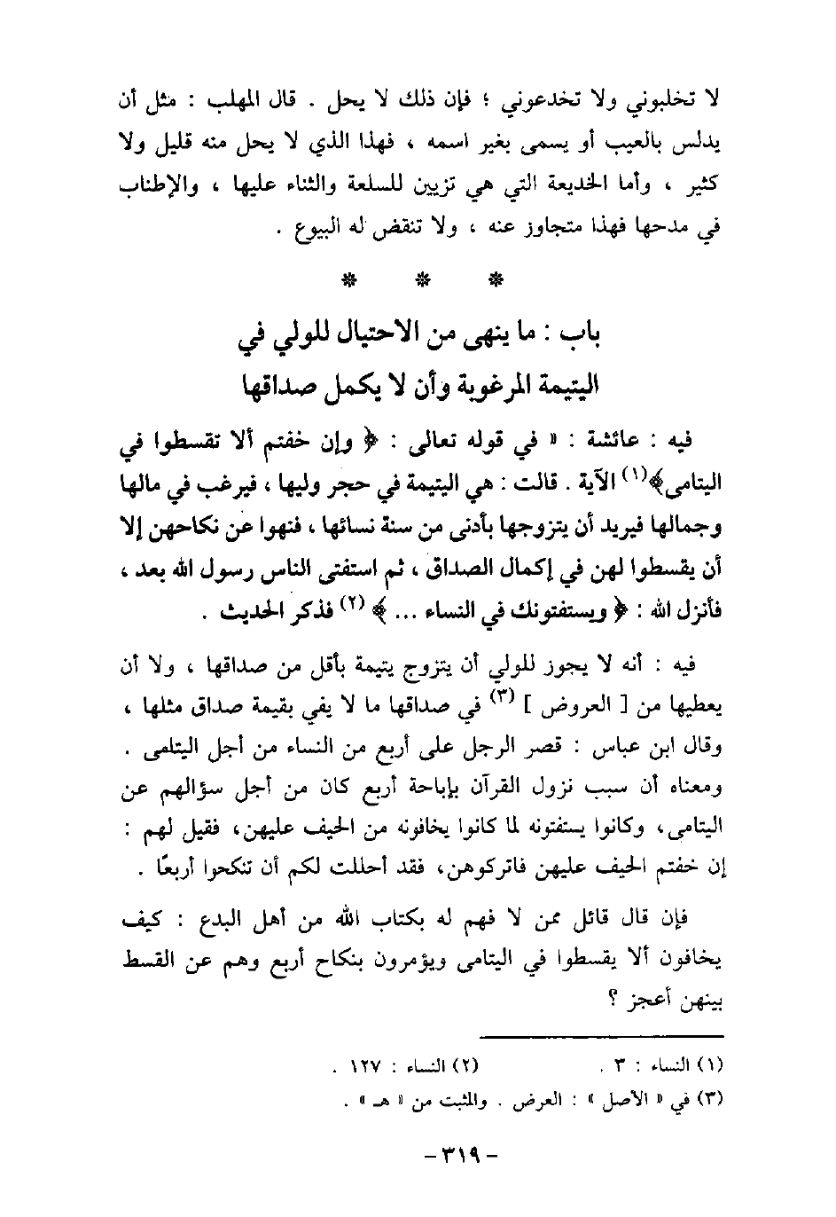 / 12 - فيه: عَائِشَةَ: (وَإِنْ خِفْتُمْ أَنْ لا تُقْسِطُوا فِى الْيَتَامَى فَانْكِحُوا مَا طَابَ لَكُمْ مِنَ النِّسَاءِ) [النساء: 3] الآية، قَالَتْ: هِىَ الْيَتِيمَةُ فِى حَجْرِ وَلِيِّهَا، فَيَرْغَبُ فِى مَالِهَا وَجَمَالِهَا، فَيُرِيدُ أَنْ يَتَزَوَّجَهَا بِأَدْنَى مِنْ سُنَّةِ نِسَائِهَا، فَنُهُوا عَنْ نِكَاحِهِنَّ إِلا أَنْ يُقْسِطُوا لَهُنَّ فِى إِكْمَالِ الصَّدَاقِ، ثُمَّ اسْتَفْتَى النَّاسُ رَسُولَ اللَّهِ (صلى الله عليه وسلم) بَعْدُ، فَأَنْزَلَ اللَّهُ: (وَيَسْتَفْتُونَكَ فِى النِّسَاءِ (فَذَكَرَ الْحَدِيثَ. فيه: أنه لا يجوز للولى أن يتزوج يتيمة بأقل من صداقها، ولا أن يعطيها من العروض فى صداقها ما لا يفى بقيمة صداق مثلها، وقال ابن عباس: قصر الرجل على أربع من النساء من أجل اليتامى. ومعناه أن سبب نزول القران بإباحة أربع كان من أجل سؤالهم عن اليتامى، وكانوا يستفتونه لما كانو يخافونه من الحيف عليهن، فقيل لهم: إن خفتم الحيف عليهن فاتركوهن، فقد أحللت لكم أن تنكحوا أربعًا. فإن قال قائل ممن لا فهم له بكتاب الله من أهل البدع: كيف يخافون ألا يقسطوا فى اليتامى ويؤمرون بنكاح أربع وهم عن القسط بينهن أعجز؟