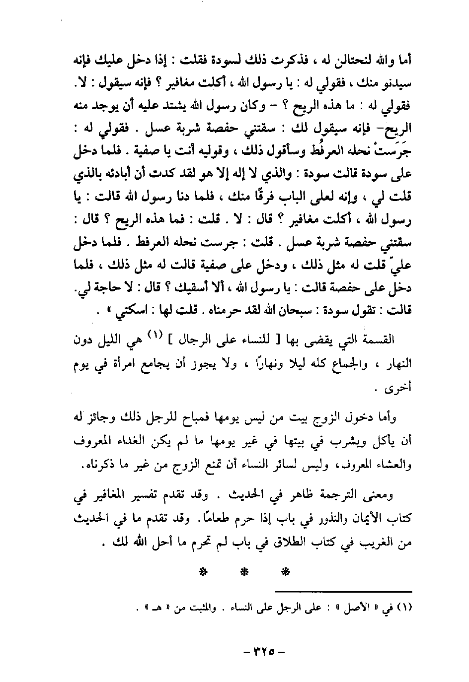 أَمَا وَاللَّهِ لَنَحْتَالَنَّ لَهُ، فَذَكَرْتُ ذَلِكَ لِسَوْدَةَ، قُلْتُ: إِذَا دَخَلَ عَلَيْكِ فَإِنَّهُ سَيَدْنُو مِنْكِ، فَقُولِى لَهُ: يَا رَسُولَ اللَّهِ أَكَلْتَ مَغَافِيرَ، فَإِنَّهُ سَيَقُولُ: لا فَقُولِى لَهُ: مَا هَذِهِ الرِّيحُ؟ وَكَانَ رَسُولُ اللَّهِ (صلى الله عليه وسلم) يَشْتَدُّ عَلَيْهِ أَنْ يُوجَدَ مِنْهُ الرِّيحُ، فَإِنَّهُ سَيَقُولُ لَكِ: سَقَتْنِى حَفْصَةُ شَرْبَةَ عَسَلٍ، فَقُولِى لَهُ: جَرَسَتْ نَحْلُهُ الْعُرْفُطَ، وَسَأَقُولُ ذَلِكِ، وَقُولِيهِ أَنْتِ يَا صَفِيَّةُ، فَلَمَّا دَخَلَ عَلَى سَوْدَةَ، قُلْتُ: تَقُولُ سَوْدَةُ: وَالَّذِى لا إِلَهَ إِلا هُوَ، لَقَدْ كِدْتُ أَنْ أُبَادِرَهُ بِالَّذِى قُلْتِ لِى، وَإِنَّهُ لَعَلَى الْبَابِ فَرَقًا مِنْكِ، فَلَمَّا دَنَا رَسُولُ اللَّهِ (صلى الله عليه وسلم) ، قُلْتُ: يَا رَسُولَ اللَّهِ، أَكَلْتَ مَغَافِيرَ، قَالَ: لا، قُلْتُ: فَمَا هَذِهِ الرِّيحُ؟ قَالَ: سَقَتْنِى حَفْصَةُ شَرْبَةَ عَسَلٍ، قُلْتُ: جَرَسَتْ نَحْلُهُ الْعُرْفُطَ، فَلَمَّا دَخَلَ عَلَىَّ، قُلْتُ لَهُ مِثْلَ ذَلِكَ، وَدَخَلَ عَلَى صَفِيَّةَ، فَقَالَتْ لَهُ مِثْلَ ذَلِكَ، فَلَمَّا دَخَلَ عَلَى حَفْصَةَ، قَالَتْ لَهُ: يَا رَسُولَ اللَّهِ، أَلا أَسْقِيكَ مِنْهُ؟ قَالَ: لا حَاجَةَ لِى بِهِ، قَالَتْ: تَقُولُ سَوْدَةُ: سُبْحَانَ اللَّهِ لَقَدْ حَرَمْنَاهُ، قَالَتْ: قُلْتُ: لَهَا اسْكُتِي) . القسمة التى يقضى بها للنساء على الرجال هى الليل دون النهار، والجماع كله ليلا ونهارًا، ولا يجوز أن يجامع امرأة فى يوم أخرى. وأما دخول الزوج بيت من ليس يومها فمباح للرجل ذلك وجائز له أن يأكل ويشرب فى بيتها فى غير يومها ما لم يكن الغداء المعروف والعشاء المعروف، وليس لسائر النساء أن تمنع الزوج من غير ما ذكرناه. ومعنى الترجمة ظاهر فى الحديث. وقد تقدم تفسير المغافير فى كتاب الأيمان والنذور فى باب إذا حرم طعامًا. وقد تقدم ما فى الحديث من الغريب فى كتاب الطلاق فى باب لم تحرم ما أحل الله لك.