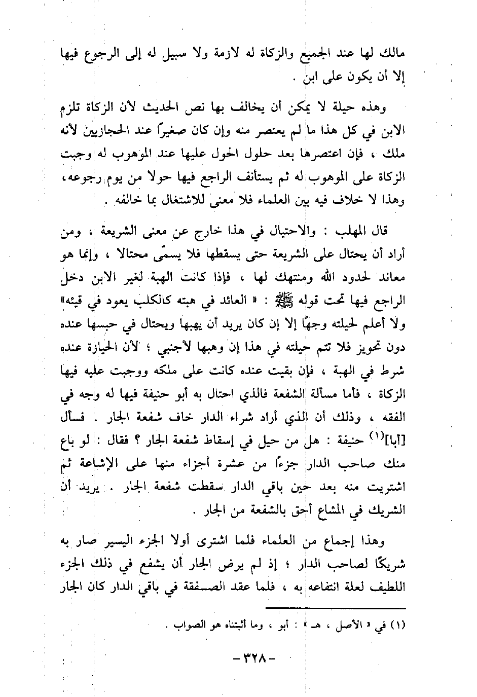 مالك لها عند الجميع والزكاة له لازمة ولا سبيل له إلى الرجوع فيها إلا أن يكون على ابن. وهذه حيلة لا يمكن أن يخالف بها نص الحديث لأن الزكاة تلزم الابن فى كل هذا ما لم يعتصر منه وإن كان صغيرًا عند الحجازيين لأنه ملك، فإن اعتصرها بعد حلول الحلول عليها عند الموهوب له وجبت الزكاة على الموهوب له ثم يستأنف الراجع فيها حولا من يوم رجوعه، وهذا لا خلاف فيه بين العلماء فلا معنى للاشتغال بما خالفه. قال المهلب: والاحتيال فى هذا خارج عن معنى الشريعة، ومن أراد أن يحتال على الشريعة حتى يسقطها فلا يسمّى محتالا، وإنما هو معاند لحدود الله ومنتهك لها، فإذا كانت الهبة لغير الابن دخل الراجع فيها تحت قوله (صلى الله عليه وسلم) : (العائد فى هبته كالكلب يعود فى قيئه) ولا أعلم لحيلته وجهًا إلا إن كان يريد أن يهبها ويحتال فى حبسها عنده دون تحويز فلا تتم حيلته فى هذا إن وهبها لأجنبى؛ لأن الحيازة عنده شرط فى الهبة، فإن بقيت عنده كانت على ملكه ووجبت عليه فيها الزكاة، فأما مسألة الشفعة فالذى احتال به أبو حنيفة فيها له وجه فى الفقه، وذلك أن الذى أراد شراء الدار خاف شفعة الجار. فسأل أبا حنيفة: هل من حيل فى إسقاط شفعة الجار؟ فقال: لو باع منك صاحب الدار جزءًا من عشرة أجزاء منها على الإشاعة ثم اشتريت منه بعد حين باقى الدار سقطت شفعة الجار. يريد أن الشريك فى المشاع أحق بالشفعة من الجار. وهذا إجماع من العلماء فلما اشترى أولا الجزء اليسير صار به شريكًا لصاحب الدار؛ إذ لم يرض الجار أن يشفع فى ذلك الجزء اللطيف لعلة انتفاعه به، فلما عقد الصفقة فى باقى الدار كان الجار