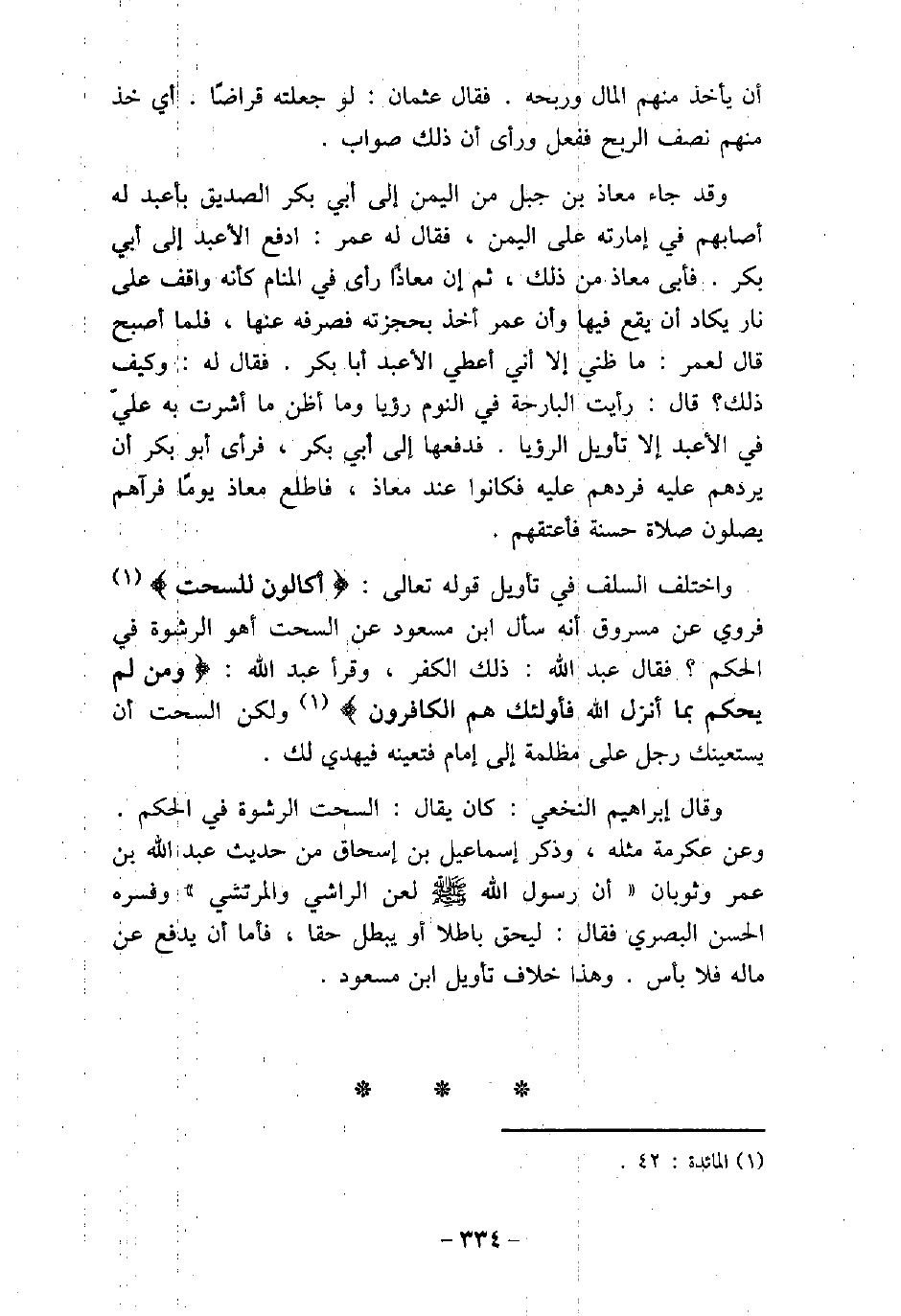 أن يأخذ منهم المال وربحه. فقال عثمان: لو جعلته قراضًا. أى خذ منهم نصف الربح ففعل ورأى أن ذلك صواب. وقد جاء معاذ بن جبل من اليمن إلى أبى بكر الصديق بأعبد له أصابهم فى إمارته على اليمن، فقال له عمر: ادفع الأعبد إلى أبى بكر. فأبى معاذ من ذلك، ثم إن معاذًا رأى فى المنام كأنه واقف على نار يكاد أن يقع فيها وأن عمر أخذ بحجزته فصرفه عنها، فلما أصبح قال لعمر: ما ظنى إلا أنى أعطى الأعبد أبا بكر. فقال له: وكيف ذلك؟ قال: رأيت البارحة فى النوم رؤيا وما أظن ما أشرت به علىّ فى الأعبد إلا تأويل الرؤيا. فدفعها إلى أبو بكر، فرأى أبو بكر أن يردهم عليه فردهم عليه فكانوا عند معاذ، فاطلع معاذ يومًا فرآهم يصلون صلاة حسنة فأعتقهم. واختلف السلف فى تأويل قوله تعالى: (أكالون للسحت) [المائدة: 42] فروى عن مسروق أنه سأل ابن مسعود عن السحت أهو الرشوة فى الحكم؟ فقال عبد الله: ذلك الكفر، وقرأ عبد الله: (ومن لم يحكم بما أنزل الله فأولئك هم الكافرون) [المائدة: 42] ولكن السحت أن يستعينك رجل على مظلمة إلى إمام فتعينه فيهدى لك. وقال إبراهيم النخعى: كان يقال: السحت الرشوة فى الحكم. وعن عكرمة مثله، وذكر إسماعيل بن إسحاق من حديث عبد الله بن عمر وثوبان (أن رسول الله (صلى الله عليه وسلم) لعن الراشى والمرتشى) وفسره الحسن البصرى فقال: ليحق باطلا أو يبطل حقا، فأما أن يدفع عن ماله فلا بأس. وهذا خلاف تأويل ابن مسعود.