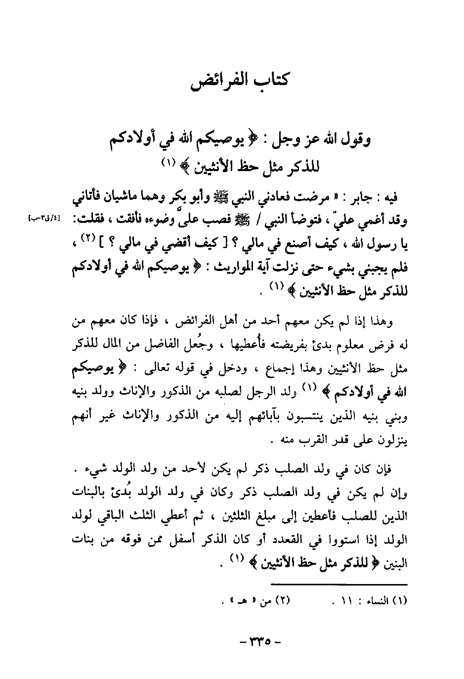 وقَوْلِ اللَّهِ عز وجل: (يُوصِيكُمُ اللَّهُ فِى أَوْلادِكُمْ لِلذَّكَرِ مِثْلُ حَظِّ الأنْثَيَيْنِ) [النساء: 11] / 1 - فيه: جَابِرَ، مَرِضْتُ، فَعَادَنِى النَّبِىّ (صلى الله عليه وسلم) وَأَبُو بَكْرٍ، وَهُمَا مَاشِيَانِ، فَأَتَانِى وَقَدْ أُغْمِىَ عَلَىَّ، فَتَوَضَّأَ النَّبِىّ (صلى الله عليه وسلم) فَصَبَّ عَلَىَّ وَضُوءَهُ، فَأَفَقْتُ، فَقُلْتُ: يَا رَسُولَ اللَّهِ، كَيْفَ أَصْنَعُ فِى مَالِى؟ كَيْفَ أَقْضِى فِى مَالِى؟ فَلَمْ يُجِبْنِى بِشَيْءٍ حَتَّى نَزَلَتْ آيَةُ الْمَوَارِيثِ) يُوصِيكُمُ اللَّهُ فِى أَوْلادِكُمْ لِلذَّكَرِ مِثْلُ حَظِّ الأنْثَيَيْنِ) [النساء: 11] . وهذا إذا لم يكن معهم أحد من أهل الفرائض، فإذا كان معهم من له فرض معلوم بدئ بفريضته فأُعطيها، وجُعل الفاضل من المال للذكر مثل حظ الأنثيين وهذا إجماع، ودخل فى قوله تعالى: (يوصيكم الله فى أولادكم) [النساء: 11] ولد الرجل لصلبه من الذكور والإناث وولد بنيه وبنى الذين ينتسبون بآبائهم إليه من الذكور والإناث غير أنهم ينزلون على قدر القرب منه. فإن كان فى ولد الصلب ذكر لم يكن لأحد من ولد الولد شىء. وإن لم يكن فى ولد الصلب ذكر وكان فى ولد الولد بُدئ بالبنات الذين للصلب فأعطين إلى مبلغ الثلثين، ثم أعطى الثلث الباقى لولد الولد إذا استووا فى القعدد أو كان الذكر أسفل ممن فوقه من بنات البنين: (للذكر مثل حظ الأنثيين) [النساء: 11] .