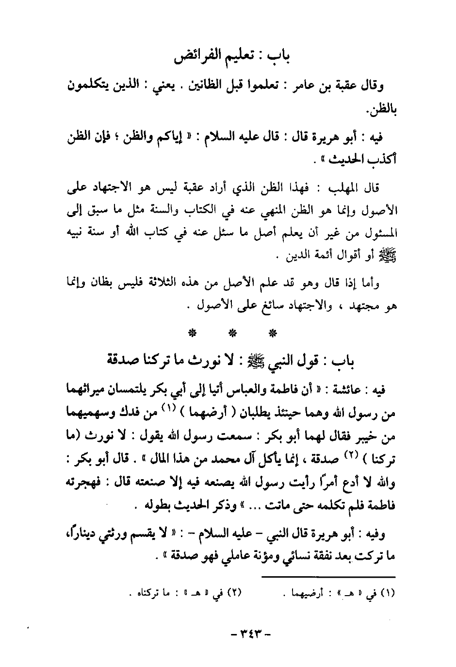 / 3 - فيه: عَائِشَةَ (أَنَّ فَاطِمَةَ وَالْعَبَّاسَ أَتَيَا إِلى أَبَا بَكْرٍ يَلْتَمِسَانِ مِيرَاثَهُمَا مِنْ رَسُولِ اللَّهِ (صلى الله عليه وسلم) ، وَهُمَا حِينَئِذٍ يَطْلُبَانِ أَرْضَيْهِمَا مِنْ فَدَكَ، وَسَهْمَهُمَا مِنْ خَيْبَرَ، فَقَالَ لَهُمَا أَبُو بَكْرٍ: سَمِعْتُ رَسُولَ اللَّهِ (صلى الله عليه وسلم) يَقُولُ: (لا نُورَثُ مَا تَرَكْنَا صَدَقَةٌ، إِنَّمَا يَأْكُلُ آلُ مُحَمَّدٍ مِنْ هَذَا الْمَالِ) ، قَالَ أَبُو بَكْرٍ: وَاللَّهِ لا أَدَعُ أَمْرًا رَأَيْتُ رَسُولَ اللَّهِ (صلى الله عليه وسلم) يَصْنَعُهُ، فِيهِ إِلا صَنَعْتُهُ، قَالَ: فَهَجَرَتْهُ فَاطِمَةُ، فَلَمْ تُكَلِّمْهُ حَتَّى مَاتَتْ) . وذكر الحديث بطوله. / 4 - وفيه: أَبو هُرَيْرَة قال النبى، (صلى الله عليه وسلم) : (لا يَقْسِم وَرَثَتِى دِينَارًا، مَا تَرَكْتُ بَعْدَ نَفَقَةِ نِسَائِى وَمَئُونَةِ عَامِلِى، فَهُوَ صَدَقَةٌ) .