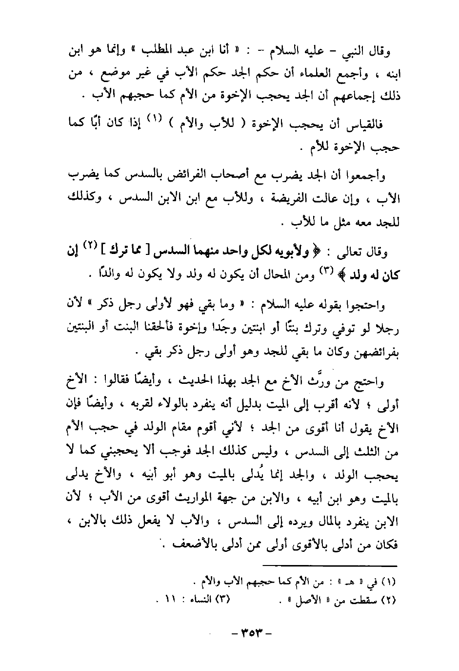 وقال النبى (صلى الله عليه وسلم) : (أنا ابن عبد المطلب) وإنما هو ابن ابنه، وأجمع العلماء أن حكم الجد حكم الأب فى غير موضع، من ذلك إجماعهم أن الجد يحجب الإخوة من الأم كما حجبهم الأب. فالقياس أن يحجب الإخوة للأب والأم إذا كان أبًا كما حجب الإخوة للأم. وأجمعوا أن الجد يضرب مع أصحاب الفرائض بالسدس كما يضرب الأب، وإن عالت الفريضة، وللأب مع ابن الابن السدس، وكذلك للجد معه مثل ما للأب. وقال تعالى: (ولأبويه لكل واحد منهما السدس مما ترك إن كان له ولد) [النساء: 11] ومن المحال أن يكون له ولد ولا يكون له والدًا. واحتجوا بقوله (صلى الله عليه وسلم) : (وما بقى فهو لأولى رجل ذكر) لأن رجلا لو توفى وترك بنتًا أو ابنتين وجَدا وإخوة فألحقنا البنت أو البنتين بفرائضهن وكان ما بقى للجد وهو أولى رجل ذكر بقى. واحتج من ورَّث الأخ مع الجد بهذا الحديث، وأيضًا فقالوا: الأخ أولى؛ لأنه أقرب إلى الميت بدليل أنه ينفرد بالولاء لقربه، وأيضًا فإن الأخ يقول أنا أقوى من الجد؛ لأنى أقوم مقام الولد فى حجب الأم من الثلث إلى السدس، وليس كذلك الجد فوجب ألا يحجبنى كما لا يحجب الولد، والجد إنما يُدلى بالميت وهو أبو أبيه، والأخ يدلى بالميت وهو ابن أبيه، والابن من جهة المواريث أقوى من الأب؛ لأن الابن ينفرد بالمال ويرده إلى السدس، والأب لا يفعل ذلك بالابن، فكان من أدلى بالأقوى أولى ممن أدلى بالأضعف.