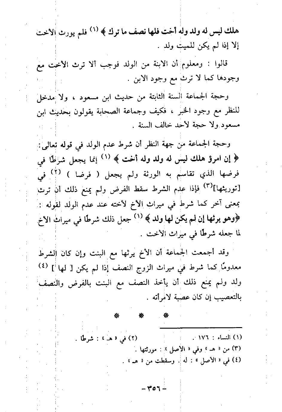 هلك ليس له ولد وله أخت فلها نصف ما ترك) [النساء: 176] فلم يورث الأخت إلا إذا لم يكن للميت ولد. قالوا: ومعلوم أن الابنة مع الولد فوجب ألا ترث الأخت مع وجودها كما لا ترث مع وجود الابن. وحجة الجماعة السنة الثابتة من حديث ابن مسعود، ولا مدخل للنظر مع وجود الخبر، فكيف وجماعة الصحابة يقولون بحديث ابن مسعود ولا حجة لأحد خالف السنة. وحجة الجماعة من جهة النظر أن شرط عدم الولد فى قوله تعالى: (إن امرؤ هلك ليس له ولد وله أخت) [النساء: 176] إنما يجعل شرطًا فى فرضها الذى تقاسم به الورثة ولم يجعل فرضا فى توريثها، فإذا عدم الشرط سقط الفرض ولم يمنع ذلك أن ترث بمعنى آخر كما شرط فى ميراث الأخ لأخته عندعدم الولد لقوله: (وهو يرثها إن لم يكن لها ولد) [النساء: 176] جعل ذلك شرطًا فى ميراث الأخ لما جعله شرطًا فى ميراث الأخت. وقد أجمعت الجماعة أن الأخ يرثها مع البنت وإن كان الشرط معدومًا كما شرط فى ميراث الزوج النصف إذا لم يكن لها ولد ولم يمنع ذلك أن يأخذ النصف مع البنت بالفرض والنصف بالتعصيب إن كان عصبة لامرأته.