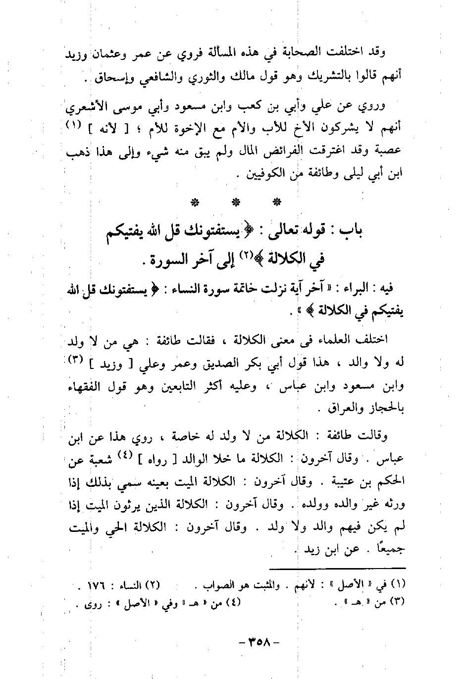 (1) / 18 - فيه: الْبَرَاءِ، آخِرُ آيَةٍ نَزَلَتْ خَاتِمَةُ سُورَةِ النِّسَاءِ: (يَسْتَفْتُونَكَ قُلِ اللَّهُ يُفْتِيكُمْ فِى الْكَلالَةِ (. اختلف العلماء فى معنى الكلالة، فقالت طائفة: هى من لا ولد له ولا والد، وهذا قول أبى بكر الصديق، وعمر، وعلى، وزيد، وابن مسعود، وابن عباس، وعليه أكثر التابعين وهو قول الفقهاء بالحجاز والعراق. وقالت طائفة: الكلالة من لا ولد له خاصة، روى هذا عن ابن عباس. وقال آخرون: الكلالة ما خلا الوالد رواه شعبة عن الحكم بن عتبة. وقال آخرون: الكلالة الميت بعينه سمى بذلك إذا ورثه غير والده وولده. وقال آخرون: الكلالة الذين يرثون الميت إذا لم يكن فيهم والد ولا ولد. وقال آخرون: الكلالة الحى والميت جميعًا. عن ابن زيد. واختار