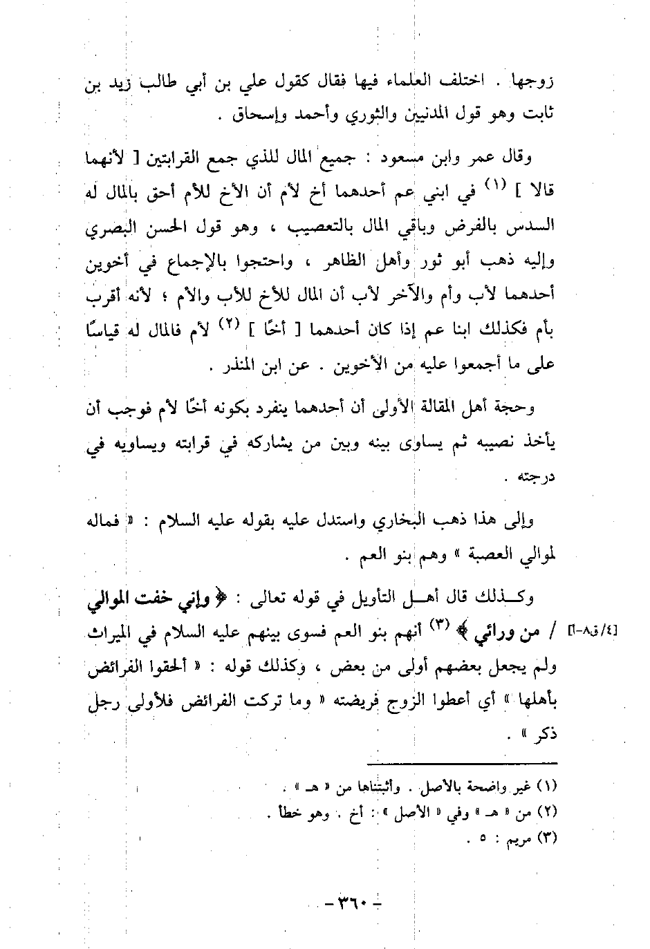 زوجها. اختلف العلماء فيها كقول على بن أبى طالب زيد بن ثابت وهو قول المدنيين والثورى وأحمد وإسحاق. وقال عمر وابن مسعود: جميع المال للذى جمع القرابتين لأنهما قالا فى ابنى عم أحدهما أخ أم أن الأخ للأم أحق بالمال له السدس بالفرض وباقى المال بالتعصيب، وهو قول الحسن البصرى وإليه ذهب أبو ثور وأهل الظاهر، واحتجوا بالإجماع فى أخوين أحدهما لأب وأم والآخر لأب أن المال للأخ للأب والأم؛ لأنه أقرب بأم فكذلك ابنا عم إذا كان أحدهما أخا لأم فالمال له قياسًا على ما أجمعوا عليه من الأخوين. عن ابن المنذر. وحجة أهل المقالة الأولى أن أحدهما ينفرد بكونه أخًا لأم فوجب أن يأخذ نصيبه ثم يساوى بينه وبين من يشاركه فى قرابته ويساويه فى درجته. وإلى هذا ذهب البخارى واستدل عليه بقوله (صلى الله عليه وسلم) : (فماله لموالى العصبة) وهم بنو العم. وكذلك قال أهل التأويل فى قوله تعالى: (وإنى خفت الموالى من ورائى) [مريم: 5] أنهم بنو العم فسوى بينهم (صلى الله عليه وسلم) فى الميراث ولم يجعل بعضهم أولى من بعض، وكذلك قوله: (ألحقوا الفرائض بأهلها) أى أعطوا الزوج فريضته (وما تركت الفرائض فلأولى رجل ذكر) .