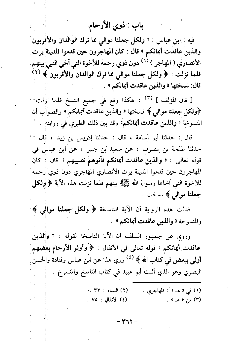 / 21 - فيه: ابْنِ عَبَّاسٍ: (وَلِكُلٍّ جَعَلْنَا مَوَالِىَ مما ترك الوالدن والأقربون وَالَّذِينَ عَاقَدَتْ أَيْمَانُكُمْ) [النساء: 33] قَالَ: كَانَ الْمُهَاجِرُونَ حِينَ قَدِمُوا الْمَدِينَةَ يَرِثُ الأنْصَارِىُّ الْمُهَاجِرِىَّ دُونَ ذَوِى رَحِمِهِ؛ لِلأخُوَّةِ الَّتِى آخَى النَّبِىُّ (صلى الله عليه وسلم) بَيْنَهُمْ، فَلَمَّا نَزَلَتْ: (وَلِكُلٍّ جَعَلْنَا مَوَالِىَ مِمَّا تَرَكَ الْوَالِدَانِ وَالأَقْرَبُونَ (، قَالَ نَسَخَتْهَا: (وَالَّذِينَ عَاقَدَتْ أَيْمَانُكُمْ (. قال المؤلف: هكذا وقع فى جميع النسخ فلما نزلت: (ولكل جعلنا موالى (نسختها) والذين عاقدت أيمانكم (والصواب أن المنسوخة) والذين عاقدت أيمانكم (وقد بين ذلك الطبرى فى روايته. قال: حدثنا أبو أسامة، قال: حدثنا إدريس بن زيد، قال: حدثنا طلحة بن مصرف، عن سعيد بن جبير، عن ابن عباس فى قوله تعالى: (والذين عاقدت أيمانكم فآتوهم نصيبهم (قال: كان المهاجرون حين قدموا المدينة يرث الأنصارى المهاجرى دون ذوى رحمه للأخوة التى آخاها رسول الله (صلى الله عليه وسلم) بينهم فلما نزلت هذه الآية) ولكل جعلنا موالى (نسخت. فدلت هذه الرواية أن الآية الناسخة) ولكل جعلنا موالى (والمنسوخة) والذين عاقدت أيمانكم (. وروى عن جمهور السلف أن الآية الناسخة لقوله: (والذين عاقدت أيمانكم (قوله تعالى فى الأنفال: (وأولو الأرحام بعضهم أولى ببعض فى كتاب الله) [الأنفال: 75] روى هذا عن ابن عباس وقتادة والحسن البصرى وهو الذى أثبت أبو عبيد فى كتاب الناسخ والمنسوخ.