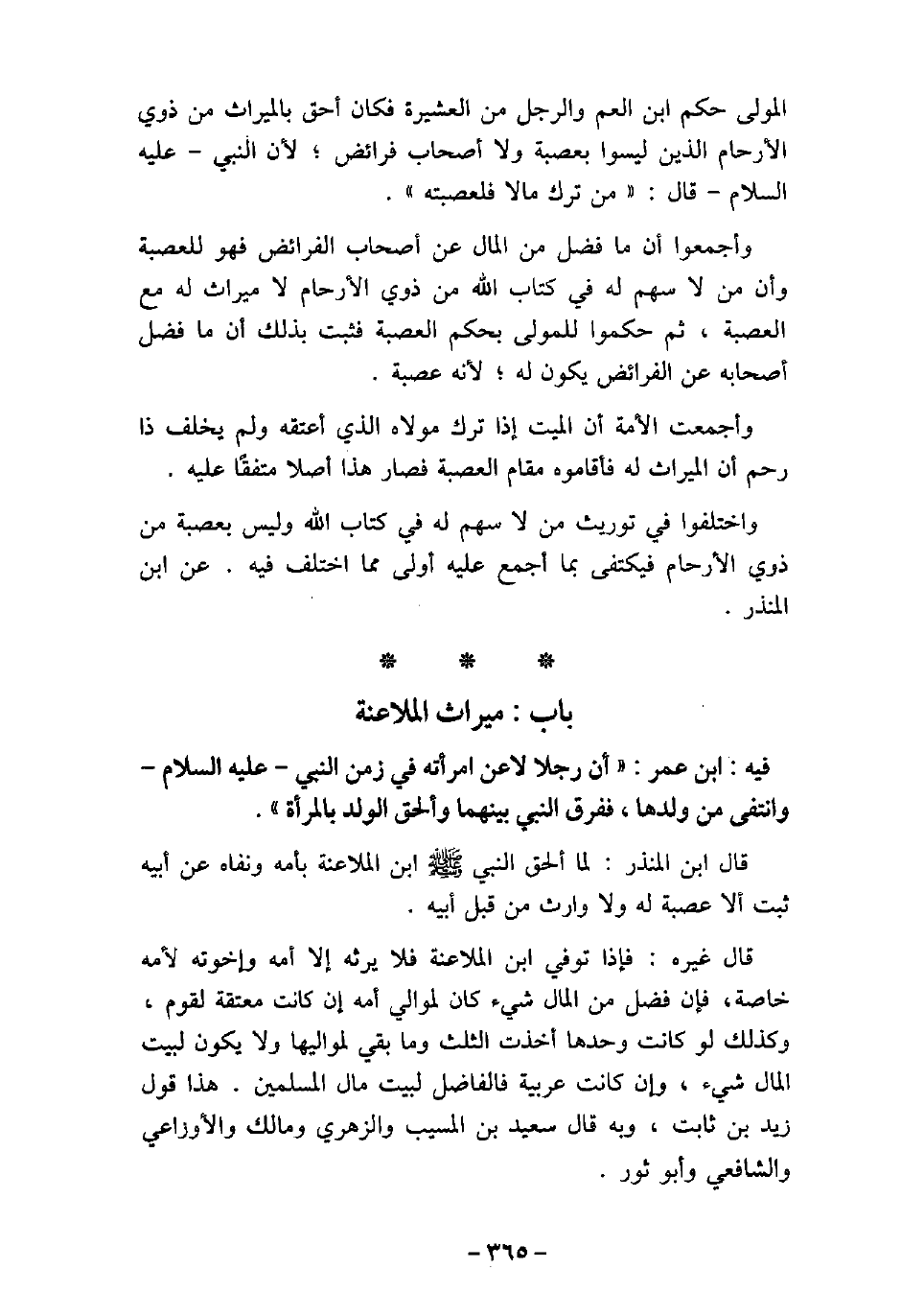 المولى حكم ابن العم والرجل من العشيرة فكان أحق بالميراث من ذوى الأرحام الذين ليسوا بعصبة ولا أصحاب فرائض؛ لأن النبى (صلى الله عليه وسلم) قال: (من ترك مالا فلعصبته) . وأجمعوا أن ما فضل من المال عن أصحاب الفرائض فهو للعصبة وأن من لا سهم له فى كتاب الله من ذوى الأرحام لا ميراث له مع العصبة، ثم حكموا للمولى بحكم العصبة فثبت بذلك أن ما فضل أصحابه عن الفرائض يكون له؛ لأنه عصبة. وأجمعت الأمة أن الميت إذا ترك مولاه الذى أعتقه ولم يخلف ذا رحم أن الميراث له فأقاموه مقام العصبة فصار هذا أصلا متفقًا عليه. واختلفوا فى توريث من لا سهم له فى كتاب الله وليس بعصبة من ذوى الأرحام فيكتفى بما أجمع عليه أولى مما اختلف فيه. عن ابن المنذر.