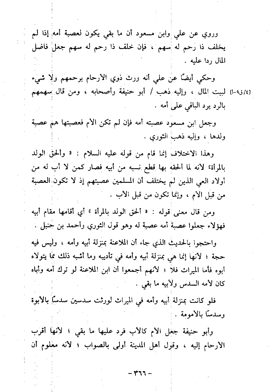 وروى عن على وابن مسعود أن ما بقى يكون لعصبة أمه إذا لم يخلف ذا رحم له سهم، فإن خلف ذا رحم له سهم جعل فاضل المال ردا عليه. وحكى أيضًا عن على أنه ورث ذوى الأرحام برحمهم ولا شىء لبيت المال، وإليه ذهب أبو حنيفة وأصحابه، ومن قال سهمهم بالرد يرد الباقى على أمه. وجعل ابن مسعود عصبته أمه فإن لم تكن الأم فعصبتها هم عصبة ولدها، وإليه ذهب الثورى. وهذا الاختلاف إنما قام من قوله (صلى الله عليه وسلم) : (وألحق الولد بالمرأة) لأنه لما ألحقه بها قطع نسبه من أبيه فصار كمن لا أب له من أولاد العى الذين لم يختلف أن المسلمين عصبتهم إذ لا تكون العصبة من قبل الأم، وإنما تكون من قبل الأب. ومن قال معنى قوله: (ألحق الولد بالمرأة) أى أقامها مقام أبيه فهؤلاء جعلوا عصبة أمه عصبة له وهو قول الثورى وأحمد بن حنبل. واحتجوا بالحديث الذى جاء أن الملاعنة بمنزلة أبيه وأمه، وليس فيه حجة؛ لأنها إنما هى بمنزلة أبيه وأمه فى تأديبه وما أشبه ذلك مما يتولاه أبوه فأما الميراث فلا؛ لأنهم أجمعوا أن ابن الملاعنة لو ترك أمه وأباه كان لأمه السدس ولأبيه ما بقى. فلو كانت بمنزلة أبيه وأمه فى الميراث لورثت سدسين سدسًا بالأبوة وسدسًا بالأمومة. وأبو حنيفة جعل الأم كالأب فرد عليها ما بقى؛ لأنها أقرب الأرحام إليه، وقول أهل المدينة أولى بالصواب؛ لأنه معلوم أن