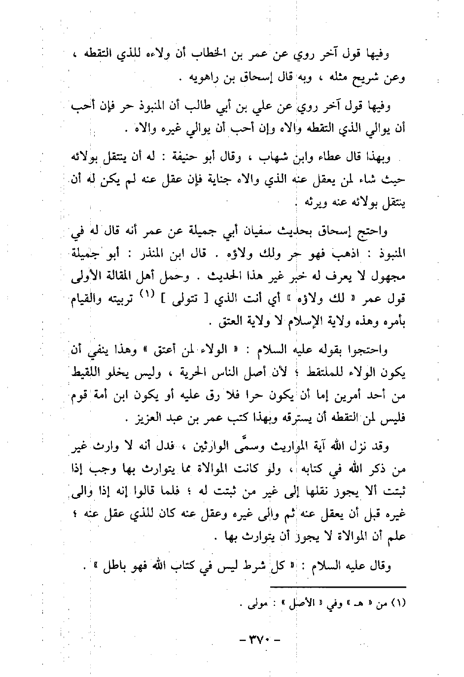 وفيها قول آخر روى عن عمر بن الخطاب أن ولاءه للذى التقطه، وعن شريح مثله، وبه قال إسحاق بن راهويه. وفيها قول آخر روى عن على بن أبى طالب أن المنبوذ حر فإن أحب أن يوالى الذى التقطه والاه وإن أحب أن يوالى غيره والاه. وبهذا قال عطاء وابن شهاب، وقال أبو حنيفة: له أن ينتقل بولائه حيث شاء لمن يعقل عنه الذى والاه جناية فإن عقل عنه لم يكن له أن ينتقل بولائه عنه ويرثه. واحتج إسحاق بحديث سفيان أبى جميلة عن عمر أنه قال له فى المنبوذ: اذهب فهو حر ولك ولاؤه. قال ابن المنذر: أبو جميلة مجهول لا يعرف له خبر غير هذا الحديث. وحمل أهل المقالة الأولى قول عمر (لك ولاؤه) أى أنت الذى تتولى تربيته والقيام بأمره وهذه ولاية الإسلام لا ولاية العتق. واحتجوا بقوله (صلى الله عليه وسلم) : (الولاء لمن أعتق) وهذا ينفى أن يكون الولاء للملتقط؛ لأن أصل الناس الحرية، وليس يخلو اللقيط من أحد أمرين إما أن يكون حرا فلا رق عليه أو يكون ابن أمة قوم فليس لمن التقطه أن يسترقه وبهذا كتب عمر بن عبد العزيز. وقد نزل الله آية المواريث وسمَّى الوارثين، فدل أنه لا وارث غير من ذكر الله فى كتابه، ولو كانت الموالاة مما يتوارث بها وجب إذا ثبتت ألا يجوز نقلها إلى غير من ثبتت له؛ فلما قالوا إنه إذا والى غيره قبل أن يعقل عنه ثم والى غيره وعقل عنه كان للذى عقل عنه؛ علم أن الموالاة لا يجوز أن يتوارث بها. وقال (صلى الله عليه وسلم) : (كل شرط ليس فى كتاب الله فهو باطل)