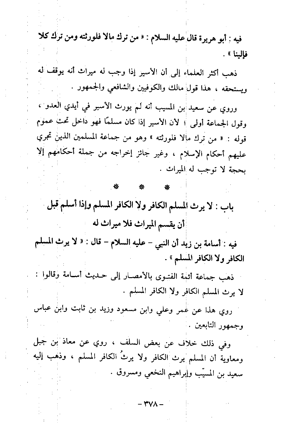 / 36 - فيه: أُسَامَةَ بْنِ زَيْدٍ، أَنَّ النَّبِىَّ (صلى الله عليه وسلم) ، قَالَ: (لا يَرِثُ الْمُسْلِمُ الْكَافِرَ، وَلا الْكَافِرُ الْمُسْلِمَ) . ذهب جماعة أئمة الفتوى بالأمصار إلى حديث أسامة وقالوا: لا يرث المسلم الكافر ولا الكافر المسلم. روى هذا عن عمر وعلى وابن مسعود وزيد بن ثابت وابن عباس وجمهور التابعين. وفى ذلك خلاف عن بعض السلف، روى عن معاذ بن جبل ومعاوية أن المسلم يرثُ الكافر ولا يرث الكافر المسلم، وذهب إليه سعيد بن المسّيب وإبراهيم النخعى ومسروق.
