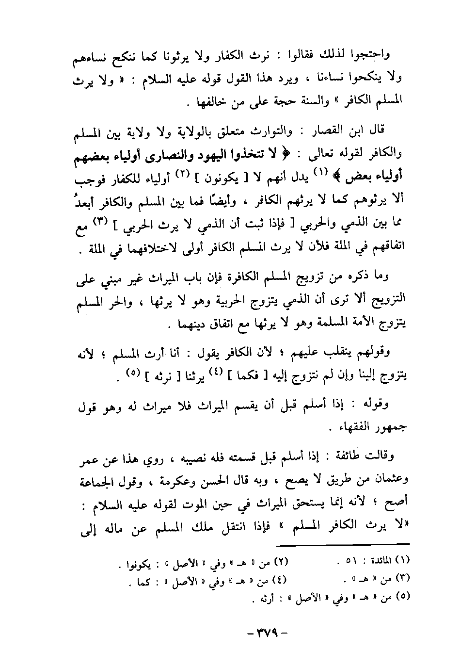 واحتجو لذلك فقالوا: نرث الكفار ولا يرثونا كما ننكح نساءهم ولا ينكحوا نساءنا، ويرد هذا القول قوله (صلى الله عليه وسلم) : (ولا يرث المسلم الكافر) والسنة حجة على من خالفها. قال ابن القصار: والتوارث متعلق بالولاية ولا ولاية بين المسلم والكافر لقوله تعالى: (لا تتخذوا اليهود والنصارى أولياء بعضهم أولياء بعض) [المائدة: 51] يدل أنهم لا يكونون أولياء للكافر فوجب ألا يرثوهم كما لا يرثهم الكافر، وأيضًا فما بين المسلم والكافر أبعدُ مما بين الذمى والحربى فإذا ثبت أن الذمى لا يرث الحربى مع اتفاقهم فى الملة فلأن لا يرث المسلم الكافر أولى لاختلافهما فى الملة. وما ذكره من تزويج المسلم الكافرة فإن باب الميراث غير مبنى على التزويج ألا ترى أن الذمى يتزوج الحربية وهو لا يرثها، والحر المسلم يتزوج الأمة المسلمة وهو لا يرثها مع اتفاق دينهما. وقولهم ينقلب عليهم؛ لأن الكافر يقول: أنا أرث المسلم؛ لأنه يتزوج إلينا وإن لم نتزوج إليه فكما يرثنا نرثه. وقوله: إذا أسلم قبل أن يقسم الميراث فلا ميراث له وهو قول جمهور الفقهاء. وقالت طائفة: إذا أسلم قبل قسمته فله نصيبه، روى هذا عن عمر وعثمان من طريق لا يصح، وبه قال الحسن وعكرمة، وقول الجماعة أصح؛ أنه إنما يستحق الميراث فى حين الموت لقوله (صلى الله عليه وسلم) : (لا يرث الكافر المسلم) فإذا انتقل ملك المسلم عن ماله إلى