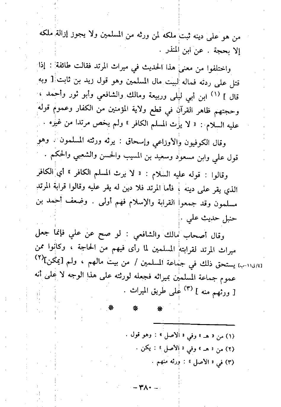 من هو على دينه ثبت ملكه لمن ورثه من المسلمين ولا يجوز إزالة ملكه إلا بحجة. عن ابن المنذر. واختلفوا من معنى هذا الحديث فى ميراث المرتد فقالت طائفة: إذا قتل على ردته فماله لبيت مال المسلمين وهو قول زيد بن ثابت وبه قال ابن أبى ليلى وربيعة ومالك والشافعى وأبو ثور وأحمد، وحجتهم ظاهر القرآن فى قطع ولاية المؤمنين من الكفار وعموم قوله (صلى الله عليه وسلم) : (لايرث المسلم الكافر) ولم يخص مرتدا من غيره. وقال الكوفيون والأوزاعى وإسحاق: يرثه ورثته المسلمون. وهو قول على وابن مسعود وسعيد بن المسيب والحسن والشعبى والحكم. وقالوا: قوله (صلى الله عليه وسلم) : (لا يرث المسلم الكافر) أى الكافر الذى يقر على دينه، فأما المرتد فلا دين له يقر عليه وقالوا قرابة المرتد مسلمون وقد جمعوا القرابة والإسلام فهم أولى. وضعف أحمد بن حنبل حديث على. وقال أصحاب مالك والشافعى: لو صح عن على فإنما جعل ميراث المرتد لقرابته المسلمين لما رأى فيهم من الحاجة، وكانوا ممن يستحق ذلك فى جماعة المسلمين من بيت مالهم، ولم يمكن عموم جماعة المسلمين بميراثه فجعله لورثته على هذا الوجه لا على أنه ورثهم منه على طريق الميراث.