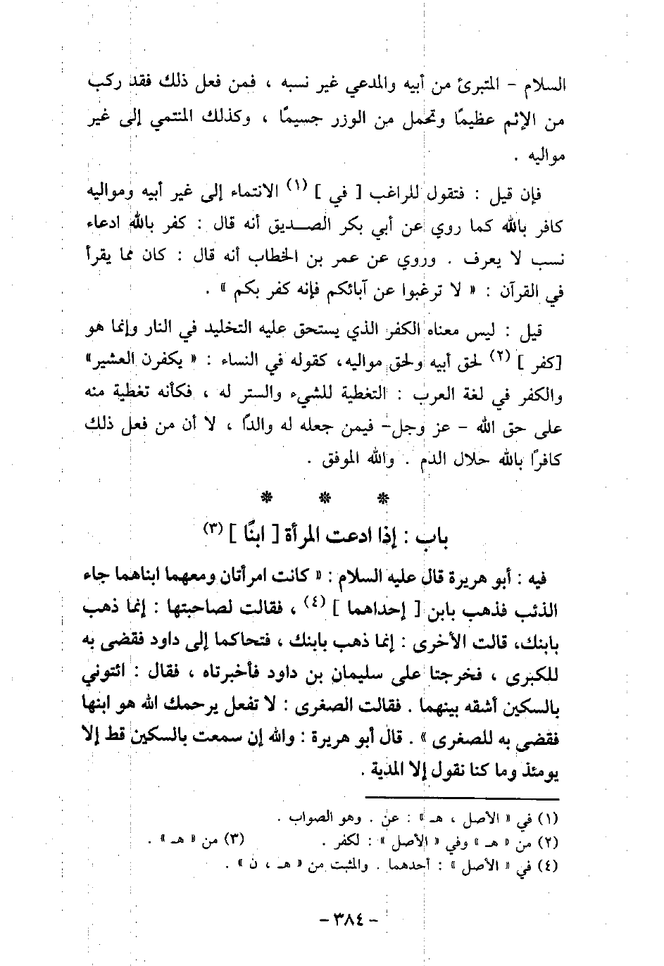 / 40 - فيه: أَبُو هُرَيْرَةَ، قَالَ (صلى الله عليه وسلم) : (كَانَتِ امْرَأَتَانِ وَمَعَهُمَا ابْنَاهُمَا جَاءَ الذِّئْبُ، فَذَهَبَ بِابْنِ إِحْدَاهُمَا، فَقَالَتْ لِصَاحِبَتِهَا: إِنَّمَا ذَهَبَ بِابْنِكِ، وَقَالَتِ الأخْرَى: إِنَّمَا ذَهَبَ بِابْنِكِ، فَتَحَاكَمَتَا إِلَى دَاوُدَ فَقَضَى بِهِ لِلْكُبْرَى، فَخَرَجَتَا عَلَى سُلَيْمَانَ بْنِ دَاوُدَ، فَأَخْبَرَتَاهُ، فَقَالَ: ائْتُونِى بِالسِّكِّينِ أَشُقُّهُ بَيْنَهُمَا، فَقَالَتِ الصُّغْرَى: لا تَفْعَلْ يَرْحَمُكَ اللَّهُ، هُوَ ابْنُهَا، فَقَضَى بِهِ لِلصُّغْرَى) . قَالَ أَبُو هُرَيْرَةَ وَاللَّهِ إِنْ سَمِعْتُ بِالسِّكِّينِ قَطُّ إِلا يَوْمَئِذٍ، وَمَا كُنَّا نَقُولُ إِلا: الْمُدْيَةَ.