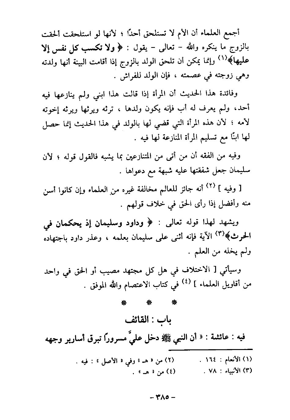 أجمع العلماء أن الأم لا تستحلق أحدًا؛ لأنها لو استلحقت ألحقت بالزوج ما ينكره والله تعالى يقول: (ولا تكسب كل نفس إلا عليها) [الأنعام: 164] وإنما يمكن أن تلحق الولد بالزوج إذا أقامت البينة أنها ولدته وهى زوجته فى عصمته، فإن الولد للفراش. وفائدة هذا الحديث أن المرأة إذا قالت هذا ابنى ولم ينازعها فيه أحد ولم يعرف له أب فإنه يكون ولدها، ترثه ويرثها ويرثه إخوته لأمه؛ لأن هذه المرأة التى قضى لها بالولد فى هذا الحديث إنما حصل لها ابنًا مع تسليم المنازعة لها فيه. وفيه من الفقه: أن من أتى من المتنازعين بما يشبه فالقول قوله؛ لأن سليمان جعل شفقتها عليه شبهة مع دعواها. وفيه: أنه جائز للعالم مخالفة غيره من العلماء وإن كانوا أسن منه وأفضل إذا رأى الحق فى خلاف قولهم. ويشهد لهذا قوله تعالى: (وداود وسليمان إذ يحكمان الحرث) [الأنبياء: 78] الآية فإنه أثنى على سليمان بعلمه، وعذر داود باجتهاده ولم يخله من العلم. وسيأتى الاختلاف فى هل كل مجتهد مصيب أو الحق فى واحد من أقاويل العلماء فى كتاب الاعتصام والله الموفق.