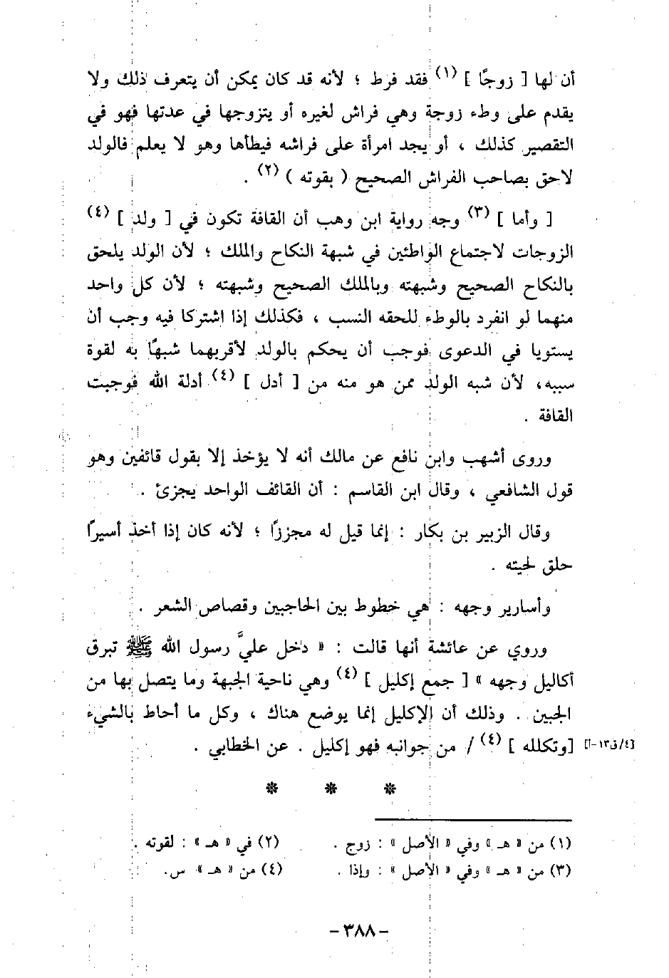 أن لها زوجًا فقد فرط؛ لأنه قد كان يمكن أن يتعرف ذلك ولا يقدم على وطء زوجة وهى فراش لغيره أو يتزوجها فى عدتها فهو فى التقصير كذلك، أو يجد امرأة على فراشه فيطأها وهولا يعلم فالولد لاحق بصاحب الفراش الصحيح بقوته. وأما وجه رواية ابن وهب أن القافة تكون فى ولد الزوجات لاجتماع الواطئين فى شبهة النكاح والملك؛ لأن الولد يلحق بالنكاح الصحيح وشبهته وبالملك الصحيح وشبهته؛ لأن كل واحد منهما لو انفرد بالوطء للحقه النسب، فكذلك إذا اشتركا فيه وجب أن يستويا فى الدعوى فوجب أن يحكم بالولد لأقربهما شبهًا به لقوة سببه، لأن شبه الولد ممن هو من أدل أدلة الله فوجبت القافة. وروى أشهب وابن نافع عن مالك أنه لا يؤخذ إلا بقول قائفين وهو قول الشافعى، وقال ابن القاسم: إن القائف الواحد يجزئ. وقال الزبير بن بكار: إنما قيل له مجززًا؛ لأنه كان إذا أخذ أسيرًا حلق لحيته. وأسارير وجهه: هى خطوط بين الحاجبين وقصاص الشعر. وروى عن عائشة أنها قالت: (دخل علىَّ رسول الله (صلى الله عليه وسلم) تبرق أكاليل وجهه) جمع إكليل وهى ناحية الجبهة وما يتصل بها من الجبين. وذلك أن الإكليل إنما يوضع هناك، وكل ما أحاط بالشىء وتكلله من جوانبه فهو إكليل. عن الخطابى.