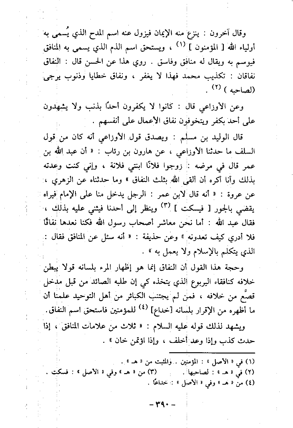 وقال آخرون: ينزع منه الإيمان فيزول عنه اسم المدح الذى يُسمى به أولياء الله المؤمنون، ويستحق اسم الذم الذى يسمى به المنافق فيوسم به ويقال له منافق وفاسق. روى هذا عن الحسن قال: النفاق نفاقان: تكذيب محمد فهذا لا يغفر، ونفاق خطايا وذنوب يرجى لصاحبه. وعن الأوزاعى قال: كانوا لا يكفرون أحدًا بذنب ولا يشهدون على أحد بكفر ويتخوفون نفاق الأعمال على أنفسهم. قال الوليد بن مسلم: ويصدق قول الأوزاعى أنه كان من قول السلف ما حدثنا الأوزاعى، عن هارون بن رئاب: (أن عبد الله بن عمر قال فى مرضه: زوجوا فلانًا ابنتى فلانة، وإنى كنت وعدته بذلك وأنا أكره أن ألقى الله بثلث النفاق) وما حدثناه عن الزهرى، عن عروة: (أنه قال لابن عمر: الرجل يدخل منا على الإمام فيراه يقضى بالجور فيسكت وينظر إلى أحدنا فيثنى عليه بذلك، فقال عبد الله: أما نحن معاشر أصحاب رسول الله (صلى الله عليه وسلم) فكنا نعدها نفاقًا فلا أدرى كيف تعدونه) وعن حذيفة: (أنه سئل عن المنافق فقال: الذى يتكلم بالإسلام ولا يعمل به) . وحجة هذا القول أن النفاق إنما هو إظهار المرء بلسانه قولاً يبطن خلافه كنافقاء اليربوع الذى يتخذه كى إن طلبه الصائد من قبل مدخل قصَّع من خلافه، فمن لم يجتنب الكبائر من أهل التوحيد علمنا أن ما أظهره من الإقرار بلسانه خداع للمؤمنين فاستحق اسم النفاق. ويشهد لذلك قوله (صلى الله عليه وسلم) : (ثلاث من علامات المنافق، إذا حدث كذب وإذا وعد أخلف، وإذا اؤتمن خان) .