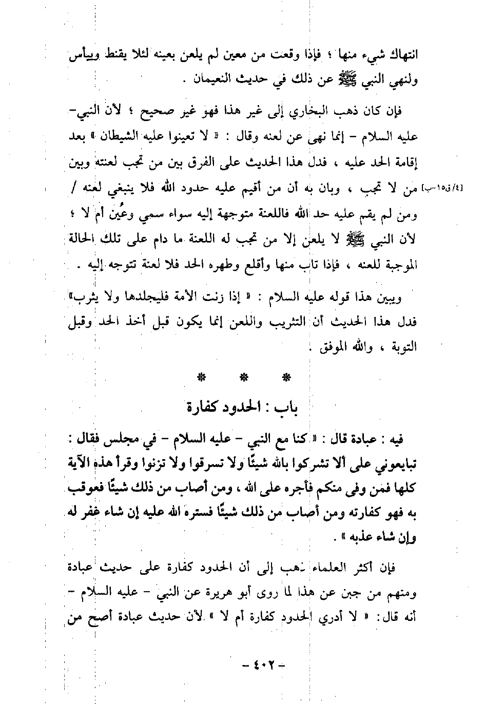 انتهاك شىء منها؛ فإذا وقعت من معين لم يلعن بعينه لئلا يقنط وييأس ولنهى النبى (صلى الله عليه وسلم) عن ذلك فى حديث النعيمان. فإن كان ذهب البخارى إلى غير هذا فهو غير صحيح؛ لأن النبى (صلى الله عليه وسلم) إنما نهى عن لعنه وقال: (لا تعينوا عليه الشيطان) بعد إقامة الحد عليه، فدل هذا الحديث على الفرق بين من تجب لعنته وبين من لا تجب، وبان به أن من أقيم عليه حدود الله فلا ينبغى لعنه ومن لم يقم عليه حد الله فاللعنة متوجهة إليه سواء سمى وعُين أم لا؛ لأن النبى (صلى الله عليه وسلم) لا يلعن إلا من تجب له اللعنة ما دام على تلك الحالة الموجبة للعنه، فإذا تاب منها وأقلع وطهره الحد فلا لعنة تتوجه إليه. ويبين هذا قوله (صلى الله عليه وسلم) : (إذا زنت الأمة فليجلدها ولا يثرب) فدل هذا الحديث أن التثريب واللعن إنما يكون قبل أخذ الحد وقبل التوبة. والله الموفق.