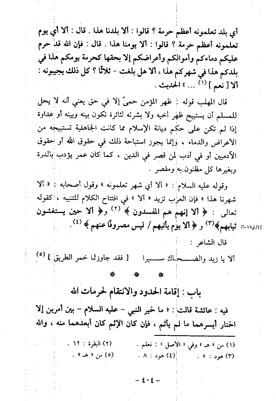 أَىُّ بَلَدٍ تَعْلَمُونَهُ أَعْظَمُ حُرْمَةً؟ قَالُوا: أَلا بَلَدُنَا هَذَا، قَالَ: أَلا أَىُّ يَوْمٍ تَعْلَمُونَهُ أَعْظَمُ حُرْمَةً؟ قَالُوا: أَلا يَوْمُنَا هَذَا، قَالَ: فَإِنَّ اللَّهَ تَبَارَكَ وَتَعَالَى قَدْ حَرَّمَ عَلَيْكُمْ دِمَاءَكُمْ وَأَمْوَالَكُمْ وَأَعْرَاضَكُمْ إِلا بِحَقِّهَا كَحُرْمَةِ يَوْمِكُمْ هَذَا، فِى بَلَدِكُمْ هَذَا، فِى شَهْرِكُمْ هَذَا، أَلا هَلْ بَلَّغْتُ؟ ثَلاثًا، كُلُّ ذَلِكَ يُجِيبُونَهُ: أَلا نَعَمْ. . . الحديث. قال المهلب قوله: ظهر المؤمن حمىً إلا فى حق يعنى أنه لا يحل للمسلم أن يستبيح ظهر أخيه ولا بشرته لثائرة تكون بينه وبينه أو عداوة إذا لم تكن على حكم ديانة الإسلام مما كانت الجاهلية تستبيحه من الأعراض والدماء، وإنما يجوز استباحة ذلك فى حقوق الله أو حقوق الآدميين أو فى أدب لمن قصر فى الدين، كما كان عمر يؤدب بالدرة وبغيرها كل مظنون به ومقصر. وقوله (صلى الله عليه وسلم) : (ألا أى شهر تعلمونه) وقول أصحابه: (ألا شهرنا هذا) فإن العرب تزيد (ألا) فى افتتاح الكلام للتنبيه، كقوله تعالى: (ألا إنهم هم المفسدون) [البقرة: 12] ) وألا حين يستغشون ثيابهم) [هود: 5] ، و) ألا يوم يأتيهم ليس مصروفًا عنهم) [هود: 4] . قال الشاعر: ألا يا زيد والضحاك سيرا فقد جاوزتما خمر الطريق