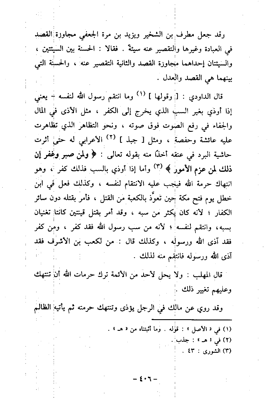 وقد جعل مطرف بن الشخير ويزيد بن مرة الجعفى مجاوزة القصد فى العبادة وغيرها والتقصير عنه سيئةً. فقالا: الحسنة بين السيئتين، والسيئتان إحداهما مجاوزة القصد والثانية التقصير عنه، والحسنة التى بينهما هى القصد والعدل. قال الداودى: وقولها وما انتقم رسول الله لنفسه، يعنى إذا أوذى بغير السب الذى يخرج إلى الكفر، مثل الأذى فى المال والجفاء فى رفع الصوت فوق صوته، ونحو التظاهر الذى تظاهرت عليه عائشة وحفصة، ومثل جبذ الأعرابى له حتى أثرت حاشية البرد فى عنقه أخذا منه بقوله تعالى: (ولمن صبر وغفر إن ذلك لمن عزم الأمور) [الشورى: 43] وأما إذا أوذى فذلك كفر، وهو انتهاك حرمة الله فيجب عليه الانتقام لنفسه، وكذلك فعل فى ابن خطل يوم فتح مكة حين تعوَّذ بالكعبة من القتل، فأمر بقتله دون سائر الكفار؛ لأنه كان يكثر من سبه، وقد أمر بقتل قينتين كانتا تغنيان بسبه، وانتقم لنفسه؛ لأنه من سب رسول الله (صلى الله عليه وسلم) فقد كفر، ومن كفر فقد آذى الله ورسوله، وكذلك قال: (من لكعب بن الأشراف فقد آذى الله ورسوله) ، فانتقم منه لذلك. قال المهلب: ولا يحل لأحد من الأئمة ترك حرمات الله أن تنتهك وعليهم تغيير ذلك. وقد روى عن مالك فى الرجل يؤذى وتنتهك حرمته ثم يأتيه الظالم