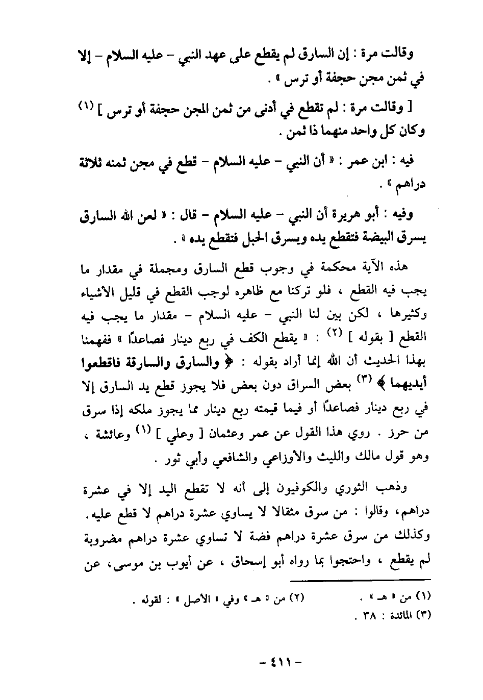 / 15 - وقالت مرة: إِنَّ يَدَ السَّارِقِ لَمْ تُقْطَعْ عَلَى عَهْدِ النَّبِىِّ (صلى الله عليه وسلم) إِلا فِى ثَمَنِ مِجَنٍّ حَجَفَةٍ أَوْ تُرْسٍ. / 16 - وقالت مرة: لَمْ تُقْطَعُ فِى أَدْنَى مِنْ ثَمَنِ المِجَن حَجَفَةٍ أَوْ تُرْسٍ كُلُّ وَاحِدٍ مِنْهُمَا ذَا ثَمَنٍ. / 17 - فيه: ابْن عُمَر، أَنَّ النَّبِىّ (صلى الله عليه وسلم) قَطَعَ فِى مِجَنٍّ ثَمَنُهُ ثَلاثَةُ دَرَاهِمَ. / 18 - وفيه: أَبُو هُرَيْرَةَ، أن النّبىّ (صلى الله عليه وسلم) قَالَ: (لَعَنَ اللَّهُ السَّارِقَ يَسْرِقُ الْبَيْضَةَ فَتُقْطَعُ يَدُهُ، وَيَسْرِقُ الْحَبْلَ فَتُقْطَعُ يَدُهُ) . هذه الآية محكمة فى وجوب قطع السارق ومجملة فى مقدار ما يجب فيه القطع، فلو تركنا مع ظاهره لوجب القطع فى قليل الأشياء وكثيرها، لكن بين لنا النبى (صلى الله عليه وسلم) مقدار ما يجب فيه القطع بقوله: (يقطع الكف فى ربع دينار فصاعدًا) ففهمنا بهذا الحديث أن الله إنما أراد بقوله: (والسارق والسارقة فاقطعوا أيديهما) [المائدة: 38] بعض السراق دون بعض فلا يجوز قطع يد السارق إلا فى ربع دينار فصاعدًا أو فيما قيمته ربع دينار مما يجوز ملكه إذا سرق من حرز. روى هذا القول عن عمر وعثمان وعلى وعائشة، وهو قول مالك والليث والأوزاعى والشافعى وأبى ثور. وذهب الثورى والكوفيون إلى أنه لا تقطع اليد إلا فى عشرة دراهم، وقالوا: من سرق مثقالا لا يساوى عشرة دراهم لا قطع عليه. وكذلك من سرق عشرة دراهم فضة لا تساوى عشرة دراهم مضروبة لم يقطع، واحتجوا بما رواه أبو إسحاق، عن أيوب بن موسى، عن