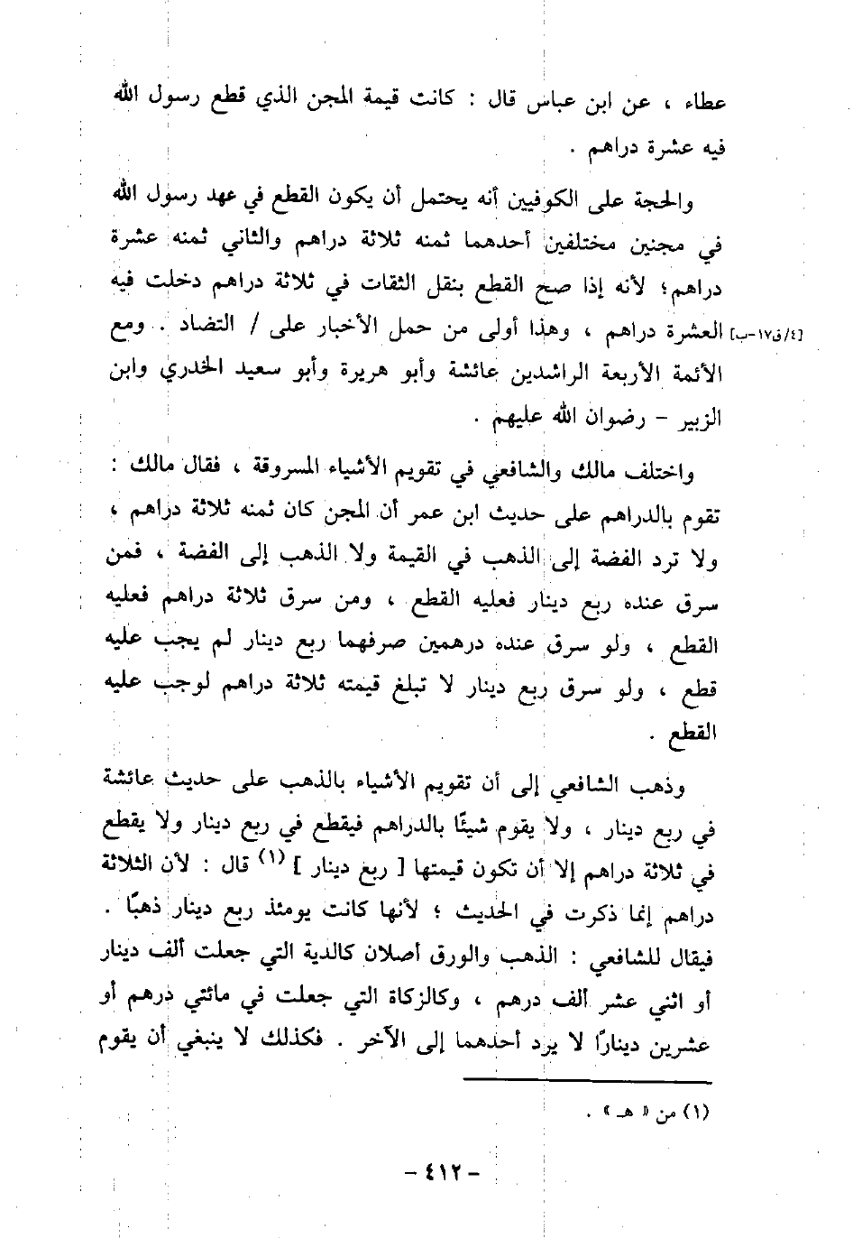 عطاء، عن ابن عباس قال: كانت قيمة المجن الذى قطع رسول الله (صلى الله عليه وسلم) فيه عشرة دراهم. والحجة على الكوفيين أنه يحتمل أن يكون القطع فى عهد رسول الله (صلى الله عليه وسلم) فى مجنين مختلفين أحدهما ثمنه ثلاثة دراهم والثانى ثمنه عشرة دراهم؛ لأنه إذا صح القطع بنقل الثقات فى ثلاثة دراهم دخلت فيه العشرة دراهم، وهذا أولى من حمل الأخبار على التضاد. ومع الأئمة الأربعة الراشدين عائشة، وأبو هريرة، وأبو سعيد الخدرى، وابن الزبير، رضوان الله عليهم. واختلف مالك والشافعى فى تقويم الأشياء المسروقة، فقال مالك: تقوم بالدراهم على حديث ابن عمر أن المجن كان ثمنه ثلاثة دراهم، ولا ترد الفضة إلى الذهب فى القيمة ولا الذهب إلى الفضة، فمن سرق عنده ربع دينار فعليه القطع، ومن سرق ثلاثة دراهم فعليه القطع، ولو سرق عنده درهمين صرفهما ربع دينار لم يجب عليه قطع، ولو سرق ربع دينار لا تبلغ قيمته ثلاثة دراهم لوجب عليه القطع. وذهب الشافعى إلى أن تقويم الأشياء بالذهب على حديث عائشة فى ربع دينار، ولا يقوم شيئًا بالدراهم فيقطع فى ربع دينار ولا يقطع فى ثلاثة دراهم إلا أن تكون قيمتها ربع دينار قال: لأن الثلاثة دراهم إنما ذكرت فى الحديث؛ لأنها كانت يومئذ ربع دينار ذهبًا. فيقال للشافعى: الذهب والورق أصلان كالدية التى جعلت ألف دينار أو اثنى عشر ألف درهم، وكالزكاة التى جعلت فى مائتى درهم أو عشرين دينارًا لا يرد أحدهما إلى الآخر. فكذلك لا ينبغى أن يقوم