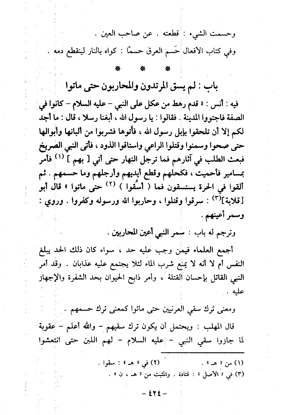 / 3 - فيه: أَنَس، قَدِمَ رَهْطٌ مِنْ عُكْلٍ عَلَى النَّبِىِّ (صلى الله عليه وسلم) كَانُوا فِى الصُّفَّةِ، فَاجْتَوَوُا الْمَدِينَةَ، فَقَالُوا: يَا رَسُولَ اللَّهِ، أَبْغِنَا رِسْلا، فَقَالَ: مَا أَجِدُ لَكُمْ، إِلا أَنْ تَلْحَقُوا بِإِبِلِ رَسُولِ اللَّهِ، فَأَتَوْهَا، فَشَرِبُوا مِنْ أَلْبَانِهَا وَأَبْوَالِهَا حَتَّى صَحُّوا وَسَمِنُوا، وَقَتَلُوا الرَّاعِىَ، وَاسْتَاقُوا الذَّوْدَ، فَأَتَى النَّبِىَّ (صلى الله عليه وسلم) الصَّرِيخُ، فَبَعَثَ الطَّلَبَ فِى آثَارِهِمْ، فَمَا تَرَجَّلَ النَّهَارُ حَتَّى أُتِىَ بِهِمْ فَأَمَرَ بِمَسَامِيرَ، فَأُحْمِيَتْ، فَكَحَلَهُمْ، وَقَطَعَ أَيْدِيَهُمْ وَأَرْجُلَهُمْ، وَمَا حَسَمَهُمْ، ثُمَّ أُلْقُوا فِى الْحَرَّةِ يَسْتَسْقُونَ، فَمَا سُقُوا حَتَّى مَاتُوا. قَالَ أَبُو قِلابَةَ: سَرَقُوا وَقَتَلُوا وَحَارَبُوا اللَّهَ وَرَسُولَهُ. وروى: وَسَمَرَ أَعْيُنَهُمْ. وترجم له باب: سمر النبى (صلى الله عليه وسلم) أعين المحاربين. أجمع العلماء فيمن وجب عليه حد، سواء كان ذلك الحد يبلغ النفس أم لا أنه لا يمنع شرب الماء لئلا يجتمع عليه عذابان. وقد أمر النبى (صلى الله عليه وسلم) القاتل بإحسان القتلة، وأمر ذابح الحيوان بحد الشفرة والإجهاز عليه. ومعنى ترك سقى العرنيين حتى ماتوا كمعنى ترك حسمهم. قال المهلب: ويحتمل أن يكون ترك سقيهم والله أعلم عقوبة لما جازوا سقى النبى (صلى الله عليه وسلم) لهم اللبن حتى انتعشوا