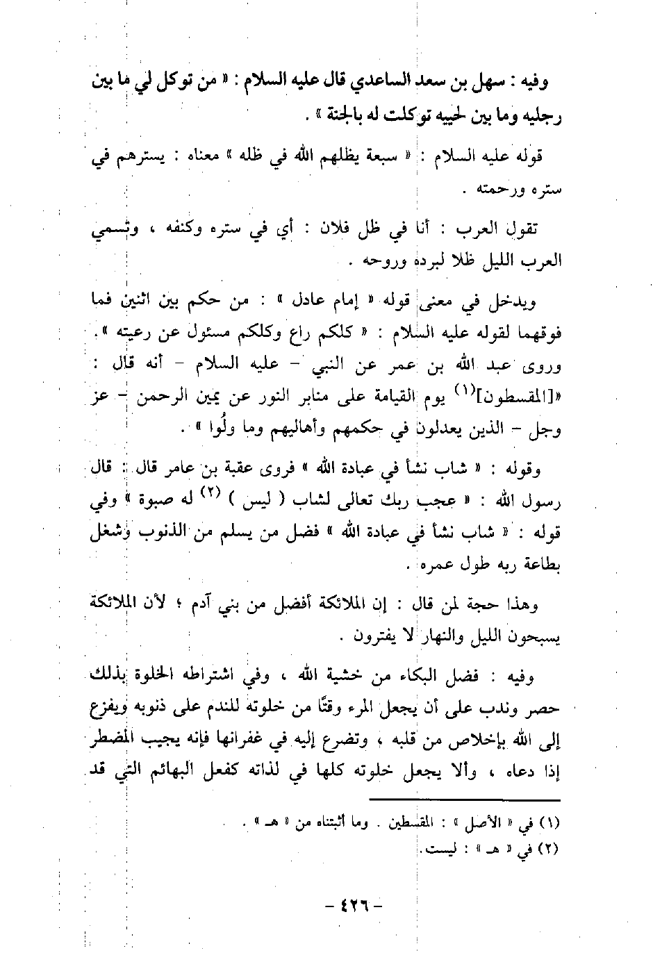 / 5 - وفيه: سَهْلِ بْنِ سَعْدٍ السَّاعِدِىِّ: قَالَ (صلى الله عليه وسلم) : (مَنْ تَوَكَّلَ لِى مَا بَيْنَ رِجْلَيْهِ وَمَا بَيْنَ لَحْيَيْهِ، تَوَكَّلْتُ لَهُ بِالْجَنَّةِ) . قوله (صلى الله عليه وسلم) : (سبعة يظللهم الله فى ظله) معناه: يسترهم فى ستره ورحمته. تقول العرب: أنا فى ظل فلان: أى فى ستره وكنفه، وتسمى العرب الليل ظلا لبرده وروحه. ويدخل فى معنى قوله (إمام عادل) : من حكم بين اثنين فما فوقهما لقوله (صلى الله عليه وسلم) : (كلكم راع وكلكم مسئول عن رعيته) . وروى عبد الله بن عمر عن النبى (صلى الله عليه وسلم) أنه قال: (المقسطون يوم القيامة على منابر النور عن يمين الرحمن عز وجل الذين يعدلون فى حكمهم وأهاليهم وما ولُوا) . وقوله: (شاب نشأ فى عبادة الله) فروى عقبة بن عامر قال: قال رسول الله (صلى الله عليه وسلم) : (عجب ربك تعالى لشاب ليس له صبوة) وفى قوله: (شاب نشأ فى عبادة الله) فضل من يسلم من الذنوب وشغل بطاعة ربه طول عمره. وهذا حجة لمن قال: إن الملائكة أفضل من بنى آدم؛ لأن الملائكة يسبحون الليل والنهار لا يفترون. وفيه: فضل البكاء من خشية الله، وفى اشتراطه الخلوة بذلك حصر وندب على أن يجعل المرء وقتًا من خلوته للندم على ذنوبه ويفزع إلى الله بإخلاص من قلبه، وتضرع إليه فى غفرانها فإنه يجيب المضطر إذا دعاه، وألا يجعل خلوته كلها فى لذاته كفعل البهائم التى قد