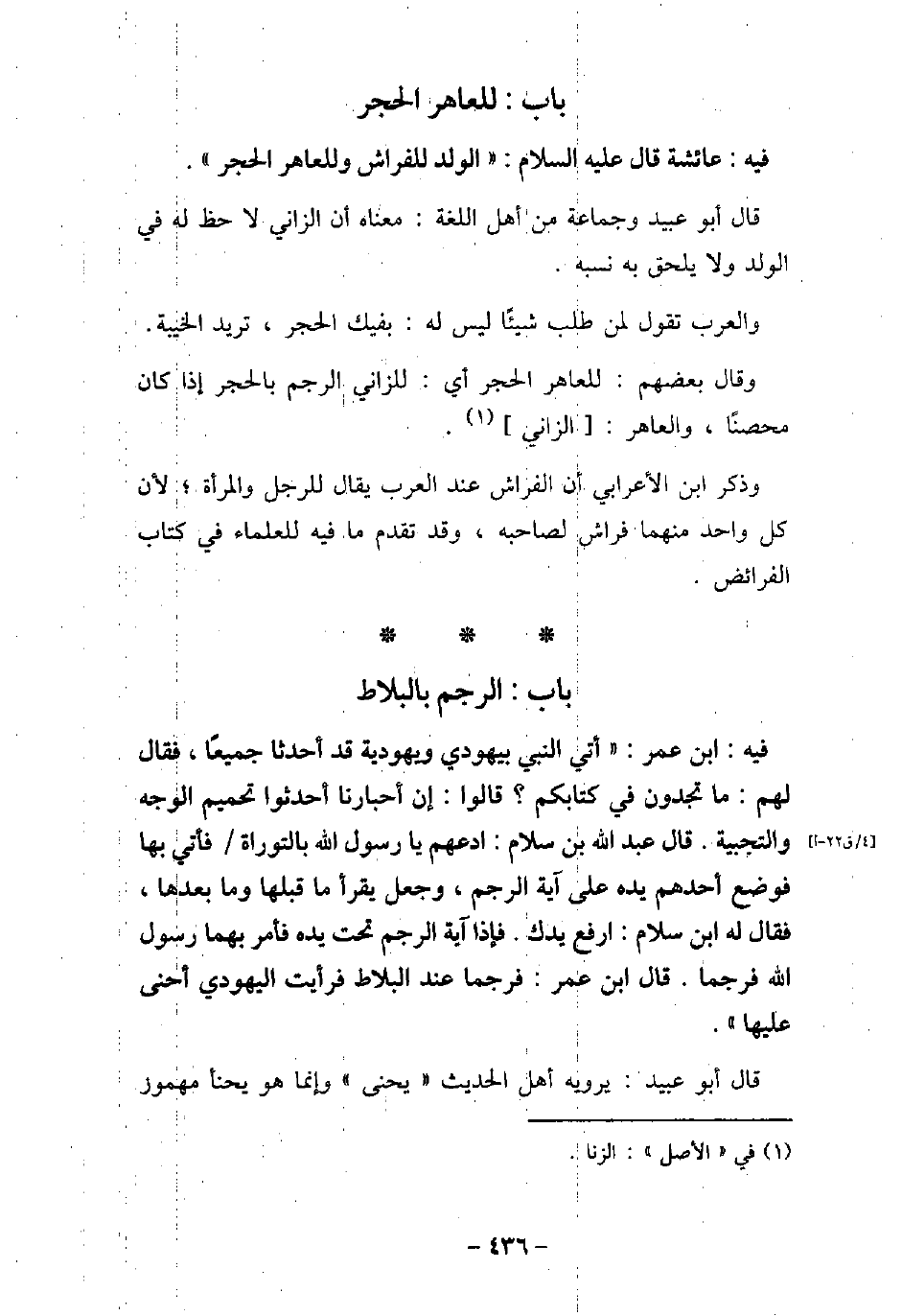 / 6 - فيه: ابْنِ عُمَرَ: (أُتِىَ النبى (صلى الله عليه وسلم) بِيَهُودِىٍّ وَيَهُودِيَّةٍ قَدْ أَحْدَثَا جَمِيعًا، فَقَالَ لَهُمْ: مَا تَجِدُونَ فِى كِتَابِكُمْ؟ قَالُوا: إِنَّ أَحْبَارَنَا أَحْدَثُوا تَحْمِيمَ الْوَجْهِ وَالتَّجْبِيهَ، قَالَ عَبْدُاللَّهِ ابْنُ سَلامٍ: ادْعُهُمْ يَا رَسُولَ اللَّهِ بِالتَّوْرَاةِ، فَأُتِىَ بِهَا، فَوَضَعَ أَحَدُهُمْ يَدَهُ عَلَى آيَةِ الرَّجْمِ، وَجَعَلَ يَقْرَأُ مَا قَبْلَهَا وَمَا بَعْدَهَا، فَقَالَ لَهُ ابْنُ سَلامٍ: ارْفَعْ يَدَكَ، فَإِذَا آيَةُ الرَّجْمِ تَحْتَ يَدِهِ، فَأَمَرَ بِهِمَا رَسُولُ اللَّهِ (صلى الله عليه وسلم) فَرُجِمَا) . قَالَ ابْنُ عُمَرَ: فَرُجِمَا عِنْدَ الْبَلاطِ، فَرَأَيْتُ الْيَهُودِىَّ أَحْنَأَ عَلَيْهَا. قال أبو عبيد: يرويه أهل الحديث (يحنى) وإنما هو يحنأ مهموز