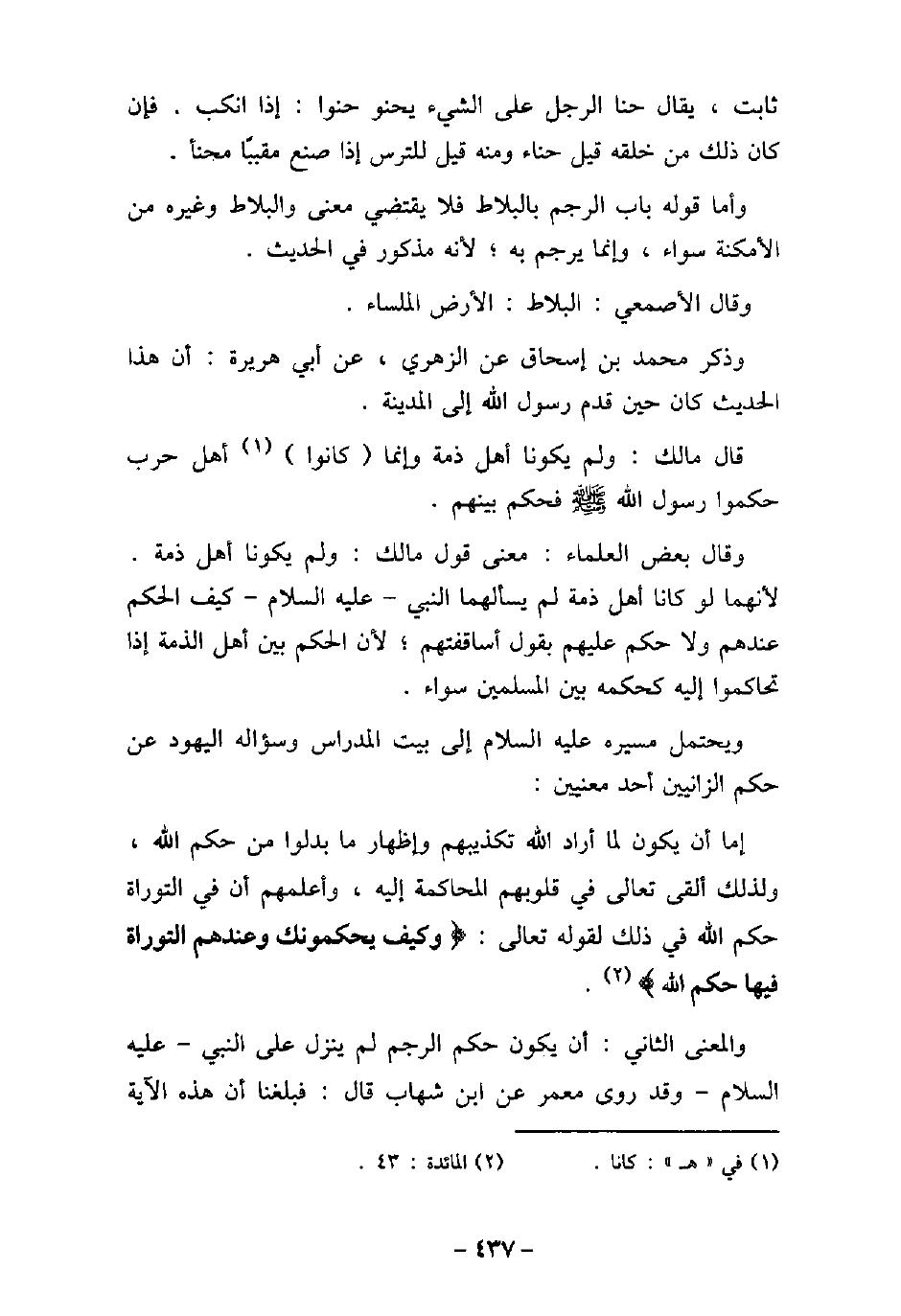 ثابت، يقال حنا الرجل على الشىء يحنو حنوا: إذا انكب. فإن كان ذلك من خلقه قيل حناء ومنه قيل للتراس إذا صنع مقببًا محنأ. وأما قوله باب الرجم بالبلاط فلا يقتضى معنى والبلاط وغيره من الأمكنة سواء، وإنما يرجم به؛ لأنه مذكور فى الحديث. وقال الأصمعى: البلاط: الأرض الملساء. وذكر محمد بن إسحاق عن الزهرى، عن أبى هريرة: أن هذا الحديث كان حين قدم رسول الله (صلى الله عليه وسلم) إلى المدينة. قال مالك: ولم يكونا أهل ذمة وإنما كانوا أهل حرب حكموا رسول الله (صلى الله عليه وسلم) فحكم بينهم. وقال بعض العلماء: معنى قول مالك: ولم يكونا أهل ذمة. لأنهما لو كانا أهل ذمة لم يسألهما النبى (صلى الله عليه وسلم) كيف الحكم عندهم ولا حكم عليهم بقول أساقفتهم؛ لأن الحكم بين أهل الذمة إذا تحاكموا إليه كحكمه بين المسلمين سواء. ويحتمل مسيره (صلى الله عليه وسلم) إلى بيت المدراس وسؤاله اليهود عن حكم الزانيين أحد معنيين: إما أن يكون لما أراد الله تكذيبهم وإظهار ما بدلوا من حكم الله، ولذلك ألقى تعالى فى قلوبهم المحاكمة إليه، وأعلمهم أن فى التوراة حكم الله فى ذلك لقوله تعالى: (وكيف يحكمونك وعندهم التوراة فيها حكم الله) [المائدة: 43] . والمعنى الثانى: أن يكون حكم الرجم لم ينزل على النبى (صلى الله عليه وسلم) وقد روى معمر عن ابن شهاب قال: فبلغنا أن هذه الآية