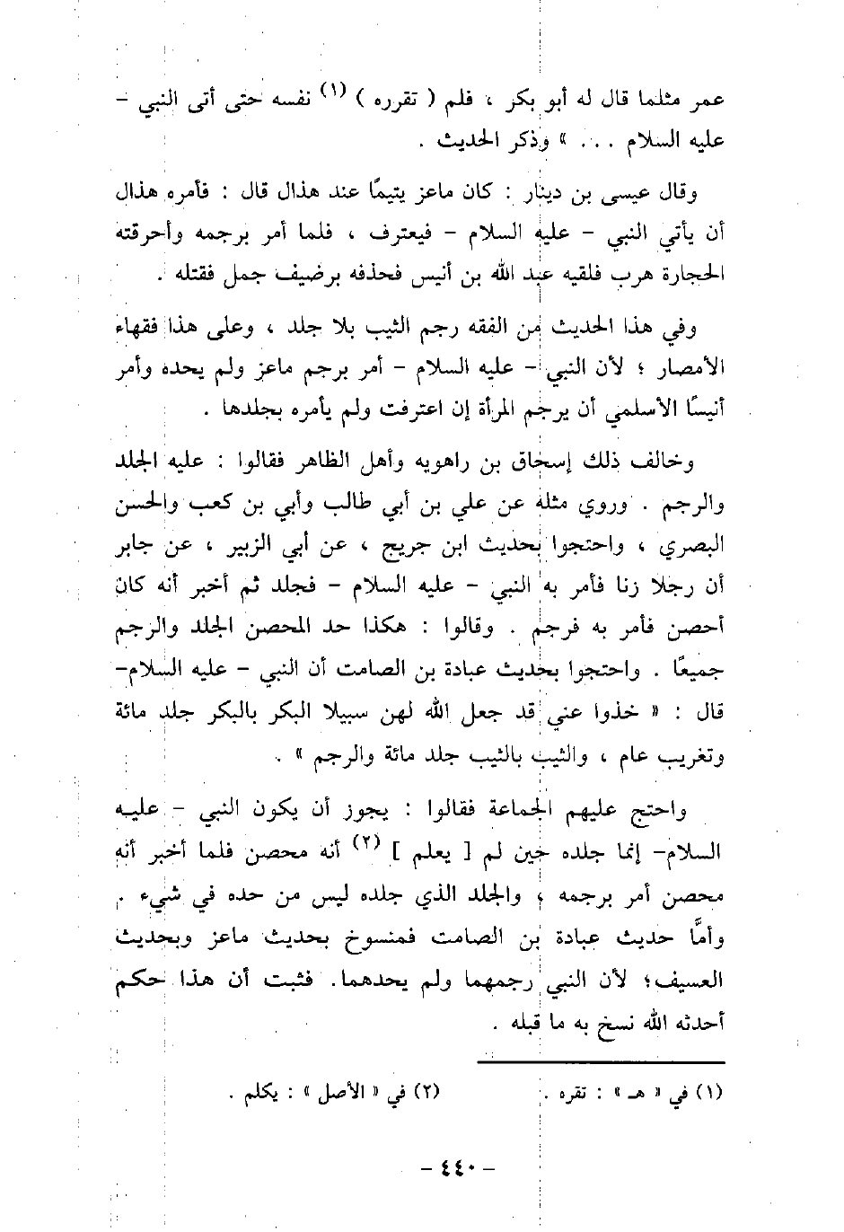 عمر مثلما قال له أبو بكر، فلم تقرره نفسه حتى أتى النبى (صلى الله عليه وسلم) . . .) وذكر الحديث. وقال عيسى بن دينار: كان ماعز يتيمًا عند هذال قال: فأمره هذال أن يأتى النبى (صلى الله عليه وسلم) فيعترف، فلما أمر برجمه وأحرقته الحجارة هرب فلقيه عبد الله بن أنيس فحذفه برضيف جمل فقتله. وفى هذا الحديث من الفقه رجم الثيب بلا جلد، وعلى هذا فقهاء الأمصار؛ لأن النبى، عليه السلام، أمر برجم ماعز ولم يحده وأمر أنيسًا الأسلمى أن يرجم المرأة إن اعترفت ولم يأمره بجلدها. وخالف ذلك إسحاق بن راهويه وأهل الظاهر فقالوا: عليه الجلد والرجم. وروى مثله عن على بن أبى طالب وأبى بن كعب والحسن البصرى، واحتجوا بحديث ابن جريج، عن أبى الزبير، عن جابر أن رجلا زنا فأمر به النبى (صلى الله عليه وسلم) فجلد ثم أخبر أنه كان أحصن فأمر به فرجم. وقالوا: هكذا حد المحصن الجلد والرجم جميعًا. واحتجوا بحديث عبادة بن الصامت أن النبى (صلى الله عليه وسلم) قال: (خذوا عنى قد جعل الله لهن سبيلا البكر بالبكر جلد مائة وتغريب عام، والثيب بالثيب جلد مائة والرجم) . واحتج عليهم الجماعة فقالوا: يجوز أن يكون النبى (صلى الله عليه وسلم) إنما جلده حين لم يعلم أنه محصن فلما أخبر أنه محصن أمر برجمه، والجلد الذى جلده ليس من حده فى شىء. وأمَّا حديث عبادة بن الصامت فمنسوخ بحديث ماعز وبحديث العسيف؛ لأن النبى (صلى الله عليه وسلم) رجمهما ولم يحدهما. فثبت أن هذا حكم أحدثه الله نسخ به ما قبله.