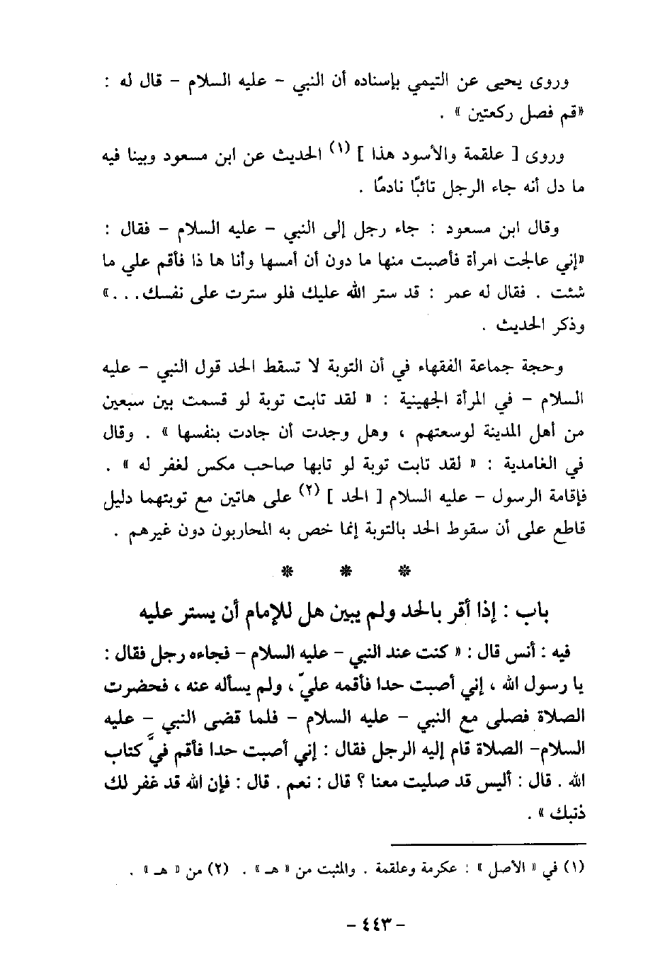 وروى يحيى عن التيمى بإسناده أن النبى (صلى الله عليه وسلم) قال له: (قم فصل ركعتين) . وروى علقمة والأسود هذا الحديث عن ابن مسعود وبينا فيه ما دل أنه جاء الرجل تائبًا نادمًا. وقال ابن مسعود: جاء رجل إلى النبى (صلى الله عليه وسلم) فقال: (إنى عالجت امرأة فأصبت منها ما دون أن أمسها وأنا ها ذا فأقم على ما شئت. فقال له عمر: قد ستر الله عليك فلو سترت على نفسك. . .) . وحجة جماعة الفقهاء فى أن التوبة لا تسقط الحد قول النبى (صلى الله عليه وسلم) فى المرأة الجهينية: (لقد تابت توبة لو قسمت بين سبعين من أهل المدينة لوسعتهم، وهل وجدت أن جادت بنفسها) . وقال فى الغامدية: (لقد تابت توبة لو تابها صاحب مكس لغفر له) . فإقامة الرسول (صلى الله عليه وسلم) الحد على هاتين مع توبتهما دليل قاطع على أن سقوط الحد بالتوبة إنما خص به المحاربون دون غيرهم.