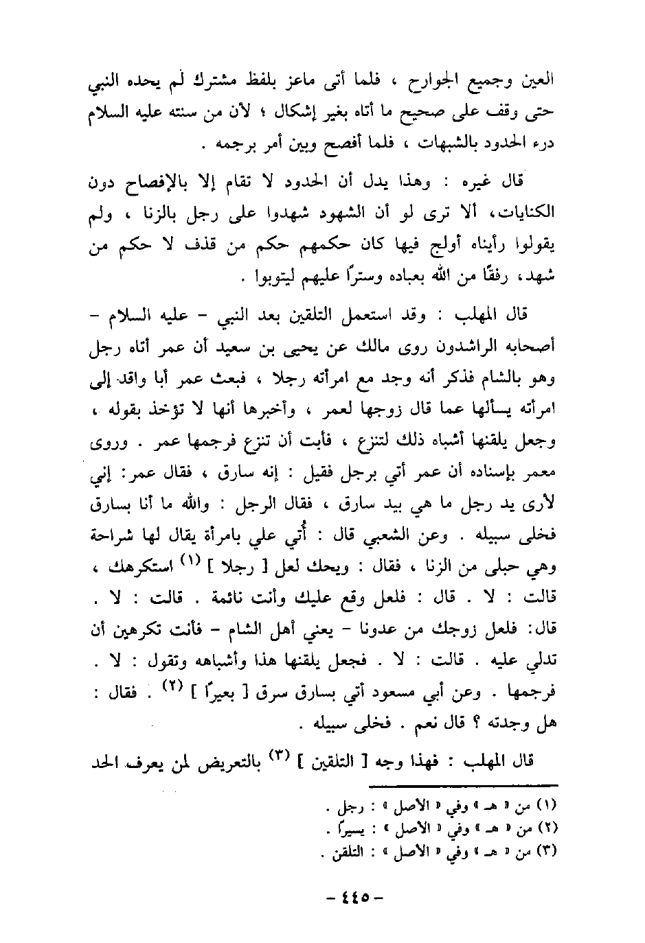 العين وجميع الجوارح، فلما أتى ماعز بلفظ مشترك لم يحده النبى (صلى الله عليه وسلم) حتى وقف على صحيح ما أتاه بغير إشكال؛ لأن من سننه (صلى الله عليه وسلم) درء الحدود بالشبهات، فلما أفصح وبين أمر برجمه. قال غيره: وهذا يدل أن الحدود لا تقام إلا بالإفصاح دون الكنايات، ألا ترى لو أن الشهود شهدوا على رجل بالزنا، ولم يقولوا رأيناه أولج فيها كان حكمهم حكم من قذف لا حكم من شهد، رفقًا من الله بعباده وسترًا عليهم ليتوبوا. قال المهلب: وقد استعمل التلقين بعد النبى (صلى الله عليه وسلم) أصحابه الراشدون روى مالك عن يحيى ابن سعيد أن عمر أتاه رجل وهو بالشام فذكر أنه وجد مع امرأته رجلا، فبعث عمر أبا واقد إلى امرأته يسألها عما قال زوجها لعمر، وأخبرها أنها لا تؤخذ بقوله، وجعل يلقنها أشباه ذلك لتنزع، فأبت أن تنزع فرجمها عمر. وروى معمر بإسناده أن عمر أتى برجل فقيل: إنه سارق، فقال عمر: إنى لأرى يد رجل ما هى بيد سارق، فقال الرجل: والله ما أنا بسارق فخلى سبيله. وعن الشعبى قال: أُتى على بامرأة يقال لها شراحة وهى حبلى من الزنا، فقال: ويحك لعل رجلا استكرهك، قالت: لا. قال: لعل وقع عليك وأنت نائمة. قالت: لا. قال: فلعل زوجك من عدونا، يعنى أهل الشام، فأنت تكرهين أن تدلى عليه. قالت: لا. فجعل يلقنها هذا وأشباهه وتقول: لا. فرجمها. وعن أبى مسعود أتى بسارق سرق بعيرًا. فقال: هل وجدته؟ قال: نعم. فخلى سبيله. قال المهلب: فهذا وجه التلقين بالتعريض لمن يعرف الحد