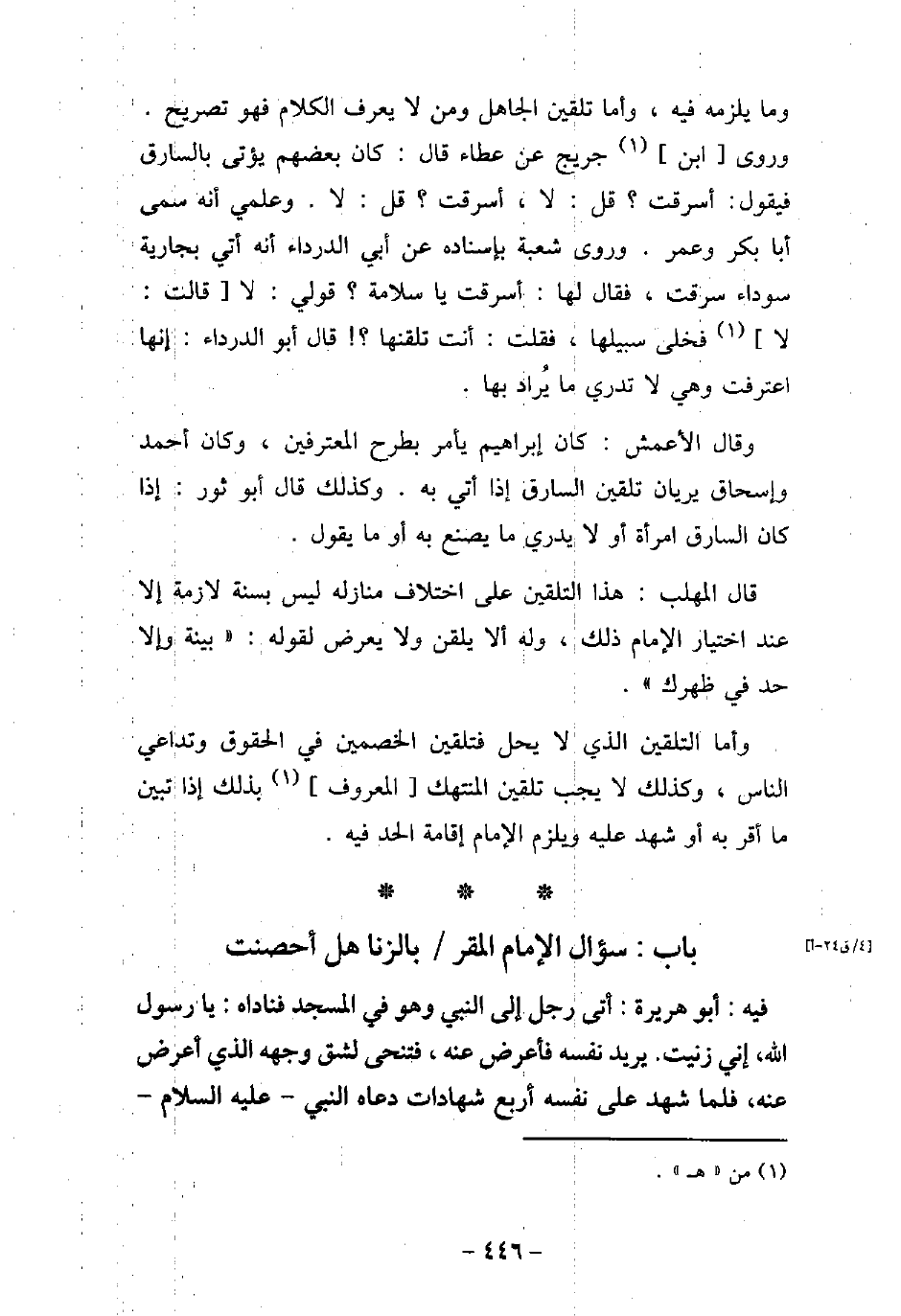 وما يلزمه فيه، وأما تلقين الجاهل ومن لا يعرف الكلام فهو تصريح. وروى ابن جريج عن عطاء قال: كان بعضهم يؤتى بالسارق فيقول: أسرقت؟ قل: لا، أسرقت؟ قل: لا. وعلمى أنه سمى أبا بكر وعمر. وروى شعبة عن أبى الدرداء أنه أتى بجارية سوداء سرقت، فقال لها: أسرقت يا سلامة؟ قولى: لا قالت: لا فخلى سبيلها، فقلت: أنت تلقنها؟ قال أبو الدرداء: إنها اعترفت وهى لا تدرى ما يُراد بها. وقال الأعمش: كان إبراهيم يأمر بطرح المعترفين، وكان أحمد وإسحاق يريان تلقين السارق إذا أتى به. وكذلك قال أبو ثور: إذا كان السارق امرأة أو لا يدرى ما يصنع به أو ما يقول. قال المهلب: هذا التلقين على اختلاف منازله بسنة لازمة إلا عند اختيار الإمام ذلك، وله ألا يلقن ولا يعرض لقوله: (بينة وإلا حد فى ظهرك) . وأما التلقين الذى لا يحل فتلقين الخصمين فى الحقوق وتداعى الناس، وكذلك لا يجب تلقين المنتهك المعروف بذلك إذا تبين ما أقر به أو شهد عليه ويلزم الإمام إقامة الحد فيه.