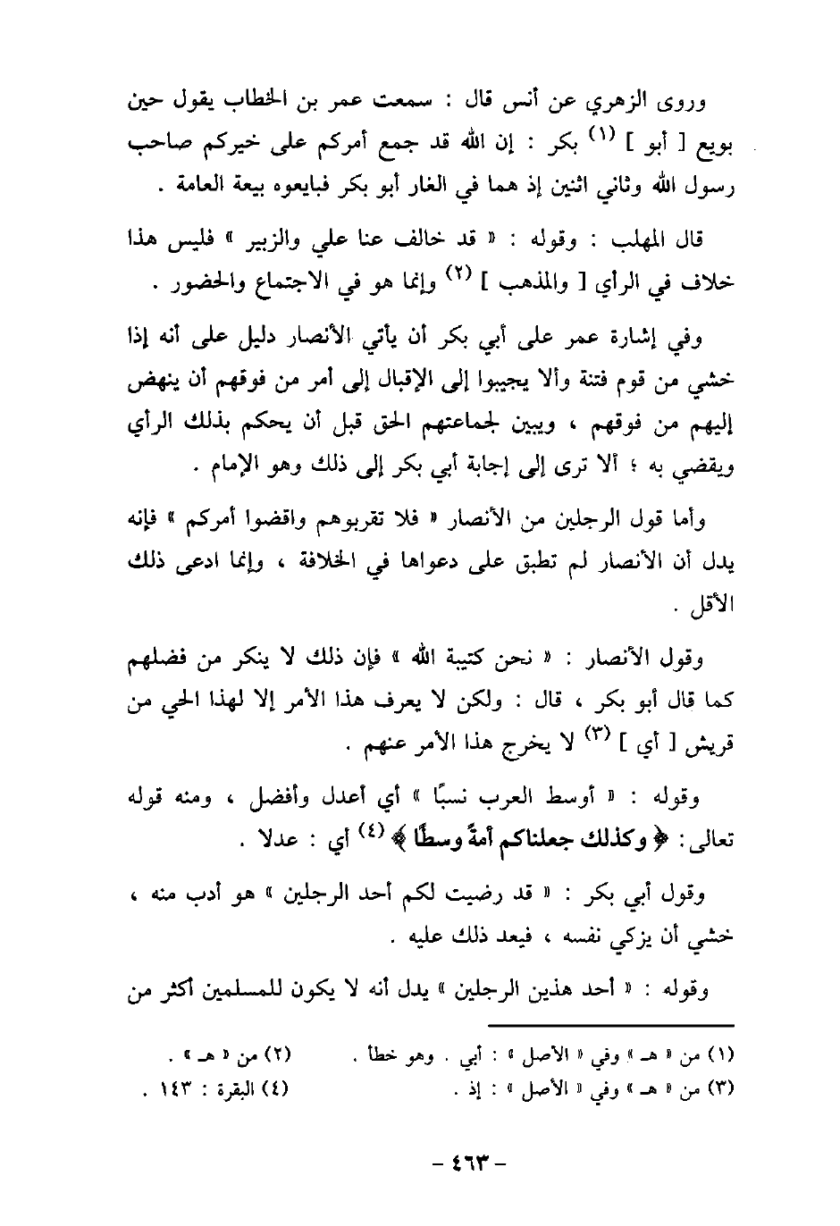 وروى الزهرى عن أنس قال: سمعت عمر بن الخطاب يقول حين بويع أبو بكر: إن الله قد جمع أمركم على خيركم صاحب رسول الله (صلى الله عليه وسلم) وثانى اثنين إذ هما فى الغار أبو بكر فبايعوه بيعة عامة. قال المهلب: وقوله: (قد خالف عنا على والزبير) فليس هذا خلاف فى الرأى والمذهب وإنما هو فى الاجتماع والحضور. وفى إشارة عمر على أبى بكر أن يأتى الأنصار دليل على أنه إذا خشى من قوم فتنة وألا يجيبوا إلى الإقبال إلى أمر من فوقهم أن ينهض إليهم من فوقهم، ويبين لجماعتهم الحق قبل أن يحكم بذلك الرأى ويقضى به؛ ألا ترى إلى إجابة أبى بكر إلى ذلك وهو الإمام. وأما قول الرجلين من الأنصار (فلا تقربوهم واقضوا أمركم) فإنه يدل أن الأنصار لم تطبق على دعواها فى الخلافة، وإنما ادعى ذلك الأقل. وقول الأنصار: (نحن كتيبة الله) فإن ذلك لا ينكر من فضلهم كما قال أبو بكر، قال: ولكن لا يعرف هذا الأمر إلا لهذا الحى من قريش أى لا يخرج هذا الأمر عنهم. وقوله: (أوسط العرب نسبًا) أى أعدل وأفضل، ومنه قوله تعالى: (وكذلك جعلناكم أمة وسطًا) [البقرة: 143] أى عدلا. وقول أبى بكر: (قد رضيت لكم أحد الرجلين) هو أدب منه، خشى أن يزكى نفسه، فيعد ذلك عليه. وقوله: (أحد هذين الرجلين) يدل أنه لا يكون للمسلمين أكثر من