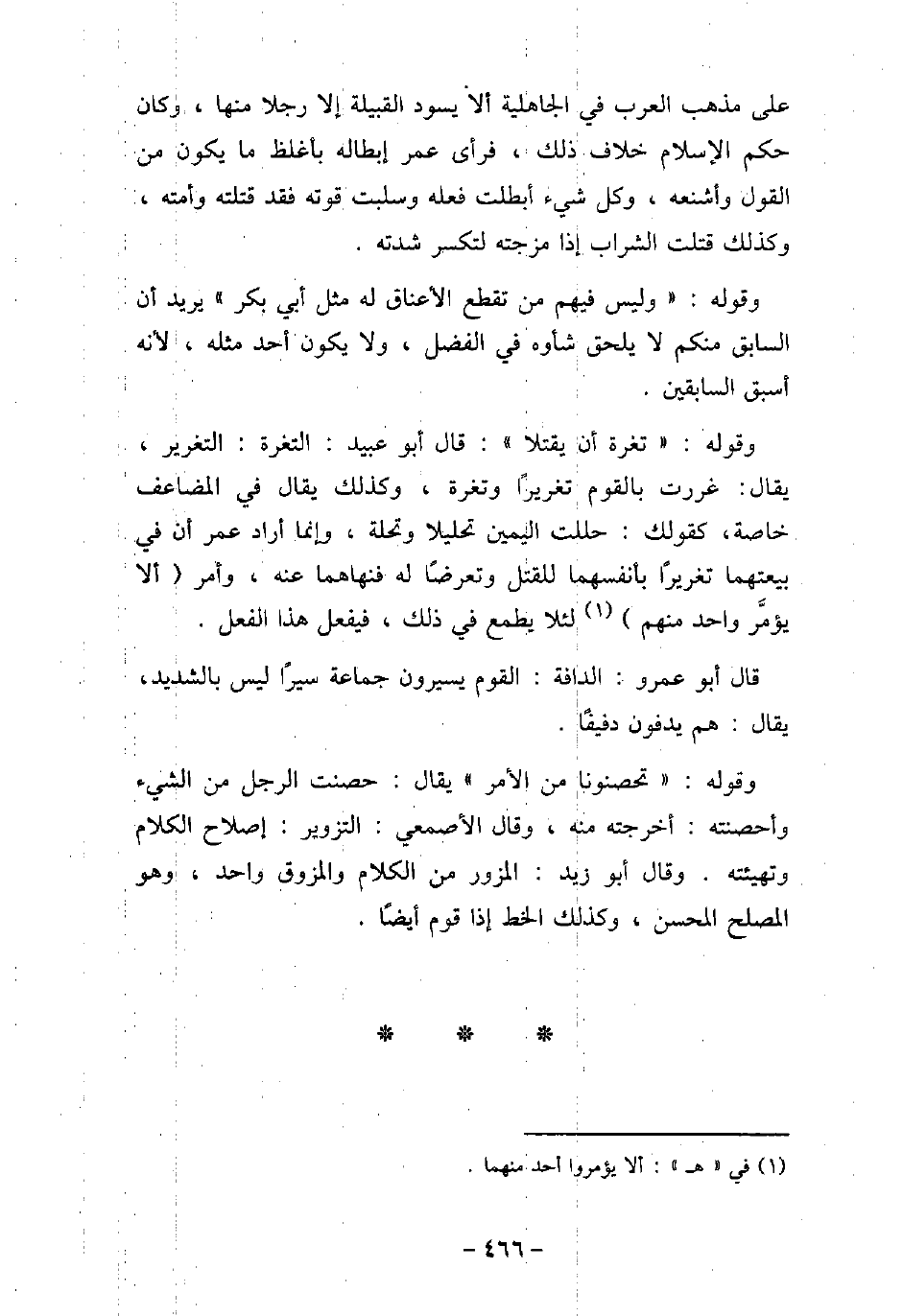 على مذهب العرب فى الجاهلية ألا يسود القبيلة إلا رجلا منها، وكان حكم الإسلام خلاف ذلك، فرأى عمر إبطاله بأغلظ ما يكون من القول وأشنعه، وكل شىء أبطلت فعله وسلبت قوته فقد قتلته وأمته، وكذلك قتلت الشراب إذا مزجته لتكسر شدته. وقوله: (وليس فيهم من تقطع الأعناق له مثل أبى بكر) يريد أن السابق منكم لا يلحق شأوه فى الفضل، ولا يكون أحد مثله، لأنه أسبق السابقين. وقوله: (تغرة أن يقتلا) : قال أبو عبيد: التغرة: التغرير، يقال: غررت بالقوم تغريرًا وتغرة، وكذلك يقال فى المضاعف خاصة، كقولك: حللت اليمين تحليلا وتحلة، وإنما أراد عمر أن فى بيعتهما تغريرًا بأنفسهما للقتل وتعرضًا له فنهاهما عنه، وأمر ألا يؤمَّر واحد منهم لئلا يطمع فى ذلك، فيفعل هذا الفعل. قال أبو عمرو: الدافة: القوم يسيرون جماعة سيرًا ليس بالشديد، يقال: هم يدفون دفيفًا. وقوله: (تحصنونا من الأمر) يقال: حصنت الرجل من الشىء وأحصنته: أخرجته منه، وقال الأصمعى: التزوير: إصلاح الكلام وتهيئته. وقال أبو زيد: المزور من الكلام والمزوق واحد، وهو المصلح المحسن، وكذلك الخط إذا قوم أيضًا.