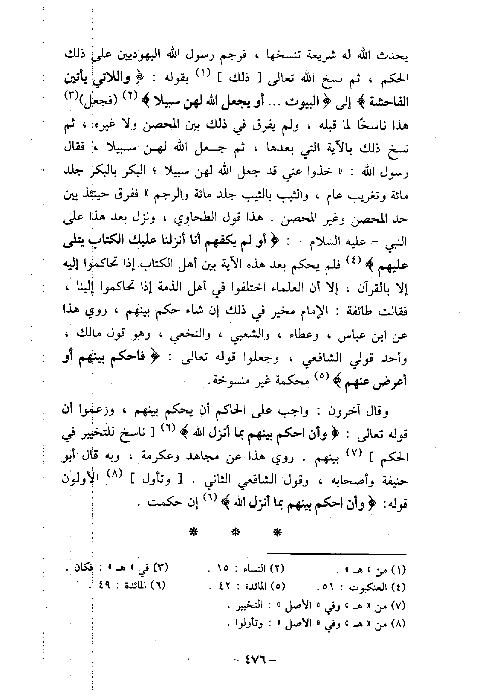 يحدث الله له شريعة تنسخها، فرجم رسول الله (صلى الله عليه وسلم) اليهوديين على ذلك الحكم، ثم نسخ الله تعالى ذلك بقوله: (واللاتى يأتين الفاحشة (إلى) البيوت. . . . أو يجعل الله لهن سبيلا) [النساء: 15] فجعل هذا ناسخًا لما قبله، ولم يفرق فى ذلك بين المحصن ولا غيره، ثم نسخ ذلك بالآية التى بعدها، ثم جعل الله لهن سبيلا، فقال رسول الله (صلى الله عليه وسلم) : (خذوا عنى قد جعل الله لهن سبيلا؛ البكر بالبكر جلد مائة وتغريب عام، والثيب بالثيب جلد مائة والرجم) ففرق حينئذ بين حد المحصن وغير المحصن. هذا قول الطحاوى، ونزل بعد هذا على النبى (صلى الله عليه وسلم) : (أولم يكفهم أنا أنزلنا عليك الكتاب يتلى عليهم) [العنكبوت: 51] ، فلم يحكم بعد هذه الآية بين أهل الكتاب إذا تحاكموا إليه إلا بالقرآن، إلا أن العلماء اختلفوا فى أهل الذمة إذا تحاكموا إلينا، فقالت طائفة: الإمام مخير فى ذلك إن شاء حكم بينهم، روى هذا عن ابن عباس، وعطاء، والشعبى، والنخعى، وهو قول مالك، وأحد قولى الشافعى، وجعلوا قوله تعالى: (فاحكم بينهم أو أعرض عنهم) [المائدة: 42] محكمة غير منسوخة. وقال آخرون: واجب على الحاكم أن يحكم بينهم، وزعموا أن قوله تعالى: (وأن احكم بينهم بما أنزل الله) [المائدة: 49] ناسخ للتخيير فى الحكم بينهم. روى هذا عن مجاهد وعكرمة، وبه قال أبو حنيفة وأصحابه، وقول الشافعى الثانى. وتأول الأولون قوله: (وأن احكم بينهم بما أنزل الله) [المائدة: 49] إن حكمت.