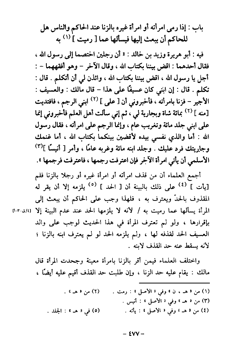 / 24 - فيه: أَبُو هُرَيْرَةَ وَزَيْدِ بْنِ خَالِد: أَنَّ رَجُلَيْنِ اخْتَصَمَا إِلَى رَسُولِ اللَّهِ (صلى الله عليه وسلم) ، فَقَالَ أَحَدُهُمَا: اقْضِ بَيْنَنَا بِكِتَابِ اللَّهِ، وَقَالَ الآخَرُ: وَهُوَ أَفْقَهُهُمَا، أَجَلْ، يَا رَسُولَ اللَّهِ، فَاقْضِ بَيْنَنَا بِكِتَابِ اللَّهِ، وَأْذَنْ لِى أَنْ أَتَكَلَّمَ، قَالَ: تَكَلَّمْ، قَالَ: إِنَّ ابْنِى كَانَ عَسِيفًا عَلَى هَذَا، قَالَ مَالِكٌ: وَالْعَسِيفُ الأجِيرُ، فَزَنَى بِامْرَأَتِهِ، فَأَخْبَرُونِى أَنَّ عَلَى ابْنِى الرَّجْمَ، فَافْتَدَيْتُ مِنْهُ بِمِائَةِ شَاةٍ وَبِجَارِيَةٍ لِى، ثُمَّ إِنِّى سَأَلْتُ أَهْلَ الْعِلْمِ، فَأَخْبَرُونِى أَنَّ مَا عَلَى ابْنِى جَلْدُ مِائَةٍ وَتَغْرِيبُ عَامٍ، وَإِنَّمَا الرَّجْمُ عَلَى امْرَأَتِهِ، فَقَالَ رَسُولُ اللَّهِ (صلى الله عليه وسلم) : أَمَا وَالَّذِى نَفْسِى بِيَدِهِ لأقْضِيَنَّ بَيْنَكُمَا بِكِتَابِ اللَّهِ أَمَّا غَنَمُكَ وَجَارِيَتُكَ فَرَدٌّ عَلَيْكَ، وَجَلَدَ ابْنَهُ مِائَةً وَغَرَّبَهُ عَامًا، وَأَمَرَ أُنَيْسًا الأسْلَمِىَّ أَنْ يَأْتِىَ امْرَأَةَ الآخَرِ، فَإِنِ اعْتَرَفَتْ، فَارْجُمْهَا، فَاعْتَرَفَتْ فَرَجَمَهَا) . أجمع العلماء أن من قذف امرأته أو امرأة غيره أو رجلا بالزنا فلم يأت على ذلك بالبينة أن الحد يلزمه إلا أن يقر له المقذوف بالحدّ ويعترف به، فلهذا وجب على الحاكم أن يبعث إلى المرأة يسألها عما رميت به لأنه لا يلزمها الحد عند عدم البينة إلا بإقرارها، ولو لم تعترف المرأة فى هذا الحديث لوجب على والد العسيف الحد لقذفه لها، ولم يلزمه الحد لو لم يعترف ابنه بالزنا؛ لأنه يسقط عنه حد القذف لابنه. واختلف العلماء فيمن أقر بالزنا بامرأة معينة وجحدت المرأة قال مالك: يقام عليه حد الزنا، وإن طلبت حد القذف أقيم عليه أيضًا،
