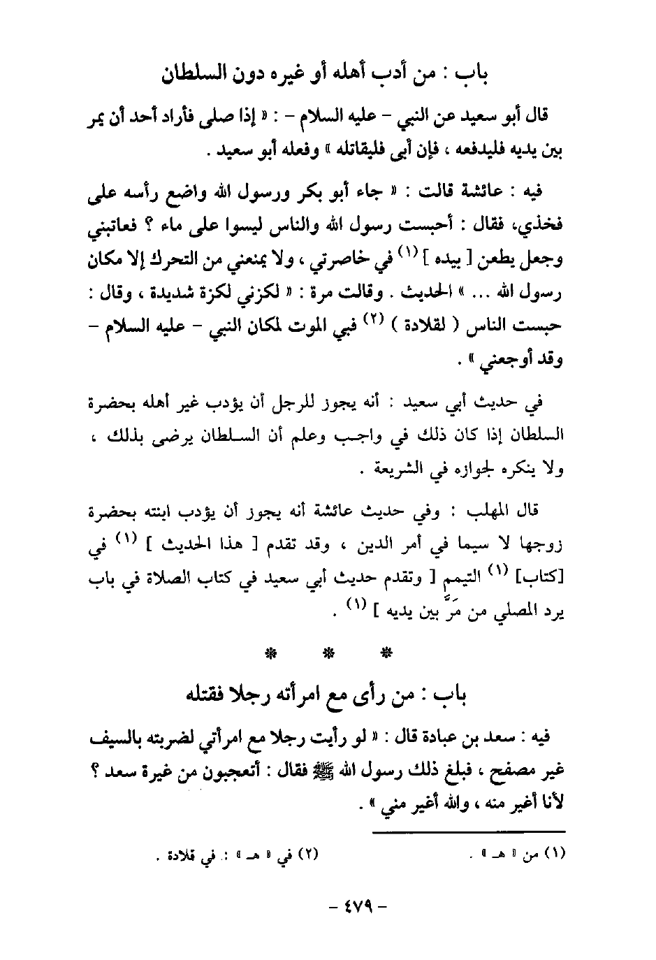/ 26 - فيه: سَعْدُ بْنُ عُبَادَةَ قَالَ: (لَوْ رَأَيْتُ رَجُلا مَعَ امْرَأَتِى لَضَرَبْتُهُ بِالسَّيْفِ غَيْرَ مُصْفَحٍ، فَبَلَغَ ذَلِكَ النَّبِىَّ (صلى الله عليه وسلم) فَقَالَ: أَتَعْجَبُونَ مِنْ غَيْرَةِ سَعْدٍ، لأنَا أَغْيَرُ مِنْهُ، وَاللَّهُ أَغْيَرُ مِنِّي) .