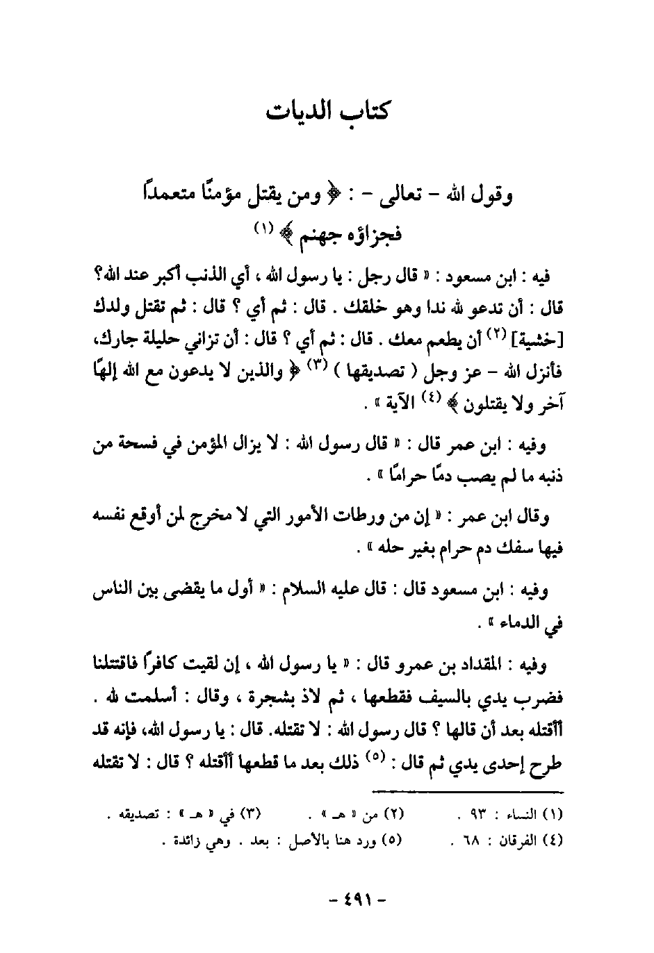 / 1 - فيه: ابْنِ مَسْعُودٍ: قَالَ رَجُلٌ: يَا رَسُولَ اللَّهِ، أَىُّ الذَّنْبِ أَكْبَرُ عِنْدَ اللَّهِ؟ قَالَ: أَنْ تَدْعُوَ لِلَّهِ نِدًّا وَهُوَ خَلَقَكَ، قَالَ: ثُمَّ أَىٌّ؟ قَالَ: ثُمَّ أَنْ تَقْتُلَ وَلَدَكَ خَشْيَةَ أَنْ يَطْعَمَ مَعَكَ؟ قَالَ: ثُمَّ أَىٌّ؟ قَالَ: ثُمَّ أَنْ تُزَانِىَ بِحَلِيلَةِ جَارِكَ، فَأَنْزَلَ اللَّهُ عَزَّ وَجَلَّ تَصْدِيقَهَا: (وَالَّذِينَ لا يَدْعُونَ مَعَ اللَّهِ إِلَهًا آخَرَ (الآيَةَ [الفرقان: 68] . / 2 - وفيه: ابْنِ عُمَرَ، قَالَ: قَالَ رَسُولُ اللَّهِ (صلى الله عليه وسلم) : (لاَ يَزَالَ الْمُؤْمِنُ فِى فُسْحَةٍ مِنْ دِينِهِ مَا لَمْ يُصِبْ دَمًا حَرَامًا) . وَقَالَ ابْنِ عُمَرَ: إِنَّ مِنْ وَرَطَاتِ الأمُورِ الَّتِى لا مَخْرَجَ لِمَنْ أَوْقَعَ نَفْسَهُ فِيهَا سَفْكَ الدَّمِ الْحَرَامِ بِغَيْرِ حِلِّهِ. / 3 - وفيه: ابْنِ مَسْعُودٍ، قَالَ: قَالَ النَّبِىُّ (صلى الله عليه وسلم) : (أَوَّلُ مَا يُقْضَى بَيْنَ النَّاسِ فِى الدِّمَاءِ) . / 4 - وفيه: الْمِقْدَادَ بْنَ عَمْرٍو قَالَ: (يَا رَسُولَ اللَّهِ، إِنِّى لَقِيتُ كَافِرًا، فَاقْتَتَلْنَا فَضَرَبَ يَدِى بِالسَّيْفِ فَقَطَعَهَا، ثُمَّ لاذَ مِنِّى بِشَجَرَةٍ، وَقَالَ: أَسْلَمْتُ لِلَّهِ، آقْتُلُهُ بَعْدَ أَنْ قَالَهَا؟ قَالَ رَسُولُ اللَّهِ (صلى الله عليه وسلم) : لا تَقْتُلْهُ، قَالَ: يَا رَسُولَ اللَّهِ، فَإِنَّهُ طَرَحَ إِحْدَى يَدَىَّ، ثُمَّ قَالَ ذَلِكَ بَعْدَ مَا قَطَعَهَا، آقْتُلُهُ؟ قَالَ: لا تَقْتُلْهُ،