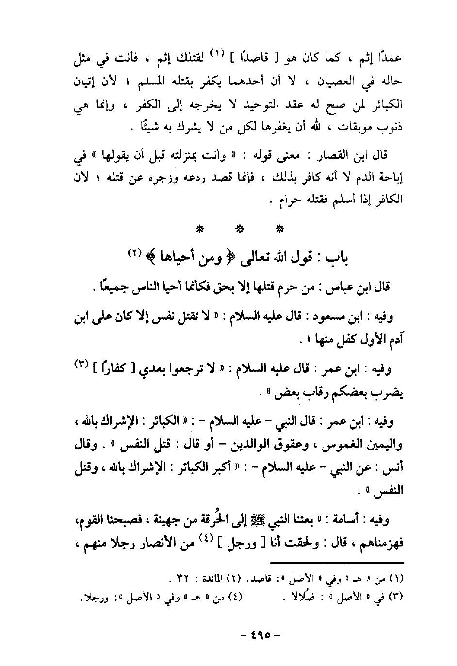 قَالَ ابْنُ عَبَّاسٍ: مَنْ حَرَّمَ قَتْلَهَا إِلا بِحَقٍّ) فَكَأَنَّمَا أَحْيَا النَّاسَ جَمِيعًا (. / 6 - وفيه: ابْنِ مَسْعُودٍ قَالَ (صلى الله عليه وسلم) : (لا تُقْتَلُ نَفْسٌ إِلا كَانَ عَلَى ابْنِ آدَمَ الأوَّلِ كِفْلٌ مِنْهَا) . / 7 - وفيه: ابْنَ عُمَرَ، قَالَ (صلى الله عليه وسلم) : (لا تَرْجِعُوا بَعْدِى كُفَّارًا يَضْرِبُ بَعْضُكُمْ رِقَابَ بَعْضٍ) . / 8 - ابْنَ عُمَرَ، قَالَ النَّبِىِّ (صلى الله عليه وسلم) : (الْكَبَائِرُ: الإشْرَاكُ بِاللَّهِ، وَالْيَمِينُ الْغَمُوسُ، وَعُقُوقُ الْوَالِدَيْنِ، أَوْ قَالَ: وَقَتْلُ النَّفْسِ) . وَقَالَ أَنَسَ عَنِ النَّبِىِّ (صلى الله عليه وسلم) أَكْبَرُ الْكَبَائِرِ: الإشْرَاكُ بِاللَّهِ، وَقَتْلُ النَّفْسِ. / 9 - وفيه: أُسَامَةَ (بَعَثَنَا رَسُولُ اللَّهِ (صلى الله عليه وسلم) إِلَى الْحُرَقَةِ مِنْ جُهَيْنَةَ، فَصَبَّحْنَا الْقَوْمَ فَهَزَمْنَاهُمْ، قَالَ: وَلَحِقْتُ أَنَا وَرَجُلٌ مِنَ الأنْصَارِ رَجُلا مِنْهُمْ،