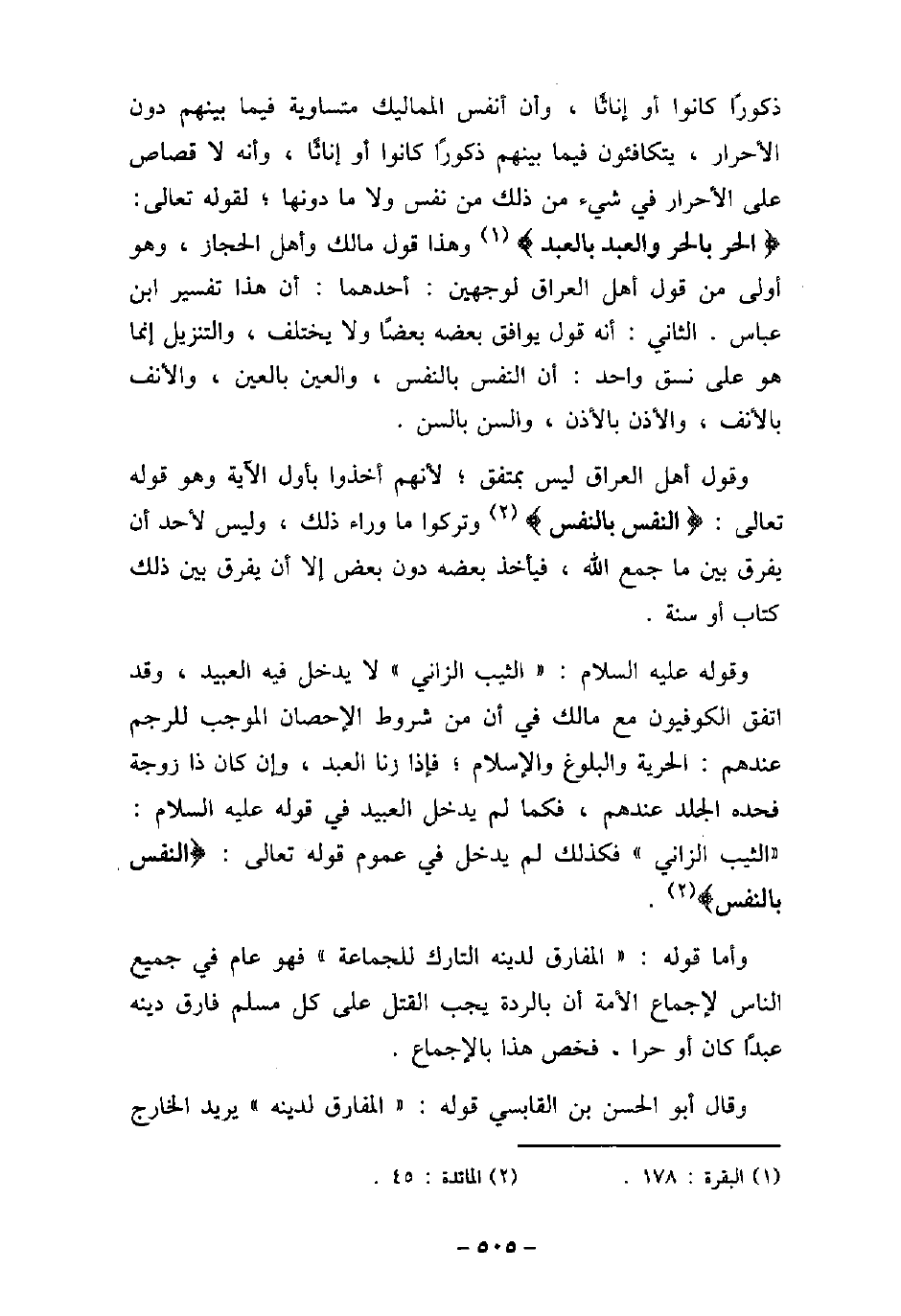 ذكورًا أو إناثًا، وأن أنفس المماليك متساوية فيما بينهم دون الأحرار، يتكافئون فيما بينهم ذكورًا كانوا أو إناثًا، وأنه لا قصاص على الأحرار فى شىء من ذلك من نفس ولا من دونها؛ لقوله تعالى: (الحر بالحر والعبد بالعبد) [المائدة: 45] وهذا قول مالك وأهل الحجاز، وهو أولى من قول أهل العراق لوجهين: أحدهما أن هذا تفسير ابن عباس. الثانى: أنه قول يوافق بعضه بعضًا ولا يختلف، والتنزيل إنما هو على نسق واحد: أن النفس بالنفس، والعين بالعين، والأنف بالأنف، والأذن بالأذن، والسن بالسن. وقول أهل العراق لس بمتفق؛ لأنهم أخذوا بأول الآية وهو قوله تعالى: (النفس بالنفس) [المائدة: 45] وتركوا ما وراء ذلك، وليس لأحد أن يفرق بين ما جمع الله، فيأخذ بعضه دون بعض إلا أن يفرق بين ذلك كتاب أو سنة. وقوله (صلى الله عليه وسلم) : (الثيب الزانى) لا يدخل فيه العبيد، وقد اتفق الكوفيون مع مالك مع أن من شروط الإحصان الموجب للرجم عندهم: الحرية والبلوغ والإسلام؛ فإذا زنا العبد، وإن كان ذا زوجة فحده الجلد عندهم، فكما لم يدخل العبيد فى قوله (صلى الله عليه وسلم) : (الثيب الزانى) فكذلك لم يدخل فى عموم قوله تعالى: (النفس بالنفس) [المائدة: 45] . وأما قوله: (المفارق لدينه التارك للجماعة) فهو عام فى جميع الناس لإجماع الأمة أن بالردة يجب القتل على كل مسلم فارق دينه عبدًا كان أو حرا، فخص هذا بالإجماع. وقال أبو الحسن بن القابسى قوله: (المفارق لدينه) يريد الخارج