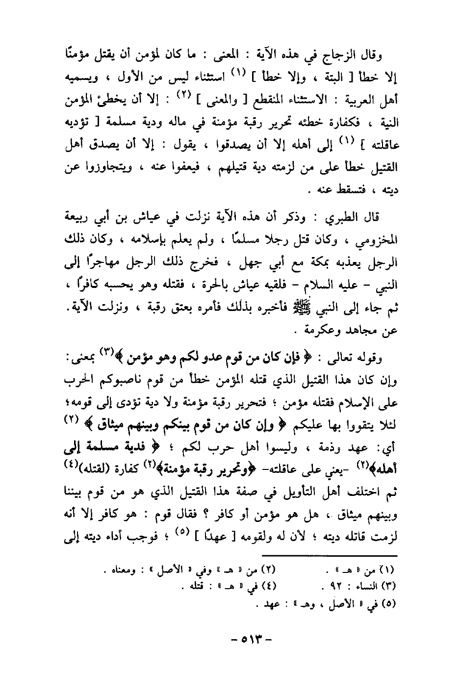 وقال الزجاج فى هذه الآية: المعنى: ما كان لمؤمن أن يقتل مؤمنًا إلا خطأ البتة، وإلا خطأ استثناء ليس من الأول، ويسميه أهل العربية: الاستثناء المنقطع والمعنى: إلا أن يخطئ المؤمن النية، فكفارة خطئه تحرير رقبة مؤمنة فى ماله ودية مسلمة تؤديه عاقلته إلى أهله إلى أن يصدقوا، يقول: إلا أن يصدق أهل القتيل خطأ على من لزمته دية قتيلهم، فيعفوا عنه، ويتجاوزوا عن ديته، فتسقط عنه. قال الطبرى: وذكر أن هذه الآية نزلت فى عياش بن أبى ربيعة المخزومى، وكان قتل رجلا مسلمًا، ولم يعلم بإسلامه، وكان ذلك الرجل يعذبه بمكة مع أبى جهل، فخرج ذلك الرجل مهاجرًا إلى النبى (صلى الله عليه وسلم) فلقيه عياش بالحرة، فقتله وهو يحسبه كافرًا، ثم جاء إلى النبى (صلى الله عليه وسلم) فأخبره بذلك فأمره بعتق رقبة، ونزلت الآية. عن مجاهد وعكرمة. وقوله تعالى: (فإن كان من قوم عدو لكم وهو مؤمن) [النساء: 92] بمعنى: وإن كان هذا القتيل الذى قتله المؤمن خطأ من قوم ناصبوكم الحرب على الإسلام فقتله مؤمن؛ فتحرير رقبة مؤمنة ولا دية تؤدى إلى قومه؛ لئلا يتقووا بها عليكم) وإن كان من قوم بينكم وبينهم ميثاق) [النساء: 92] ، أى عهد وذمة، وليسوا أهل حرب لكم؛) فدية مسلمة إلى أهله) [النساء: 92] ، يعنى على عاقلته،) وتحرير رقبة مؤمنة) [النساء: 92] كفارة لقتله ثم اختلف أهل التأويل فى صفة هذا القتيل الذى هو من قوم بيننا وبينهم ميثاق، هل هو مؤمن أو كافر؟ فقال قوم: هو كافر إلا أنه لزمت قاتله ديته؛ لأن له ولقومه عهدًا؛ فوجب أداء ديته إلى